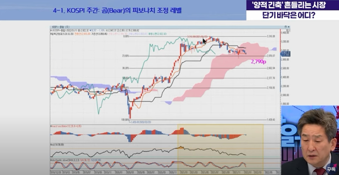 그러나 곰 시각으로 보면 이제 조정이 시작된 것으로 보이는 상황이다. 일목균형표상의 구름대 하단으로 내려올 가능성이 크고 피보나치로 봐도 아직 작년 3월 저점에서 올라온 3316을 고점으로 봤을 때 아직 23.6%를 살짝 터치한 상태. 나는 작년부터 3300이 역사적 고점이 될 것이라 주장하고 있으나 물론 여기서 더 올라갈 수도 있다. 그건 아무도 모르지만 확률적으로 하락파동에 들어섰을 가능성이 높다. 게다가 미국이 긴축 시작한다고 벼르고 있으니.