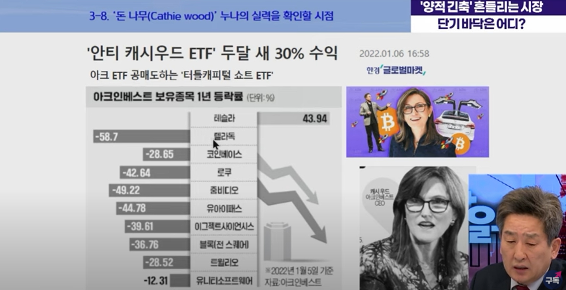 나는 별로 좋아하지 않는 돈나무언니의 펀드는 -30% 수익률을 기록 중이며, 아크 ETF를 공매도하는 터틀캐피털 쇼트 ETF는 30% 수익을 기록 중이다. 돈지랄장에서 100% 수익냈다고 좋아했던 캐시우드의 펀드는 기로에 서 있다. 내가 볼 때 이런식으로 하다간 폭망각이다.