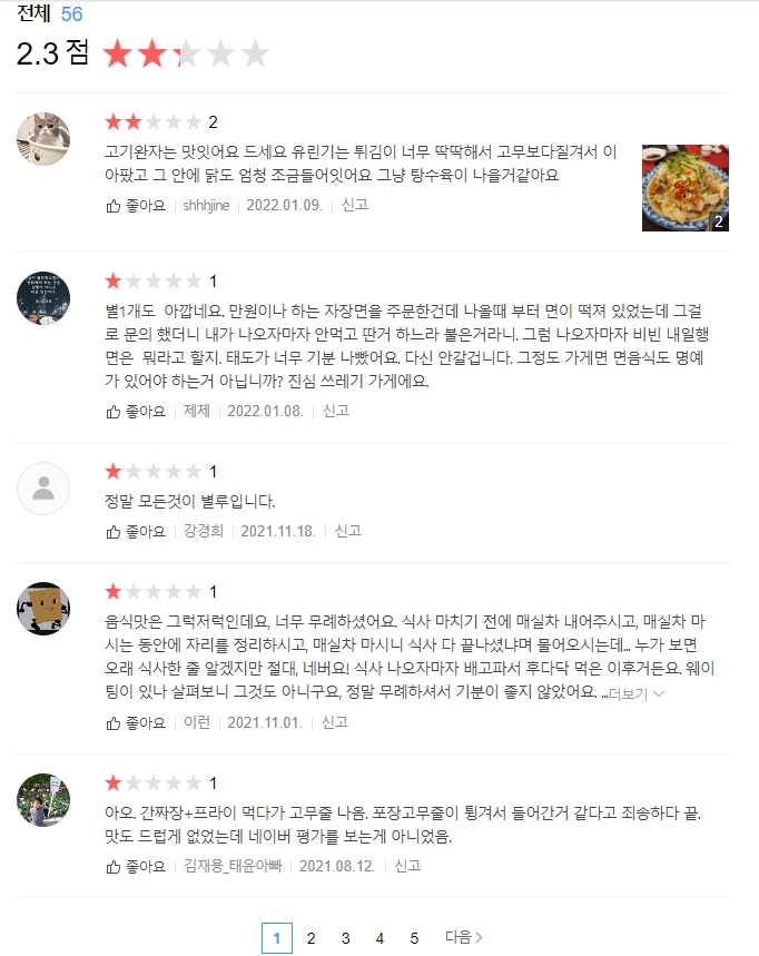 카카오맵 평점은 낮은 편. 맛도 친절도 형편 없다는 최근 반응이 많다. 나처럼 서비스에 무딘 사람도 불편할 정도였으니 예상은 된다. 짜장면도 짜장이 저런 맛이라면 분명히 맛있지는 않을 것이다.