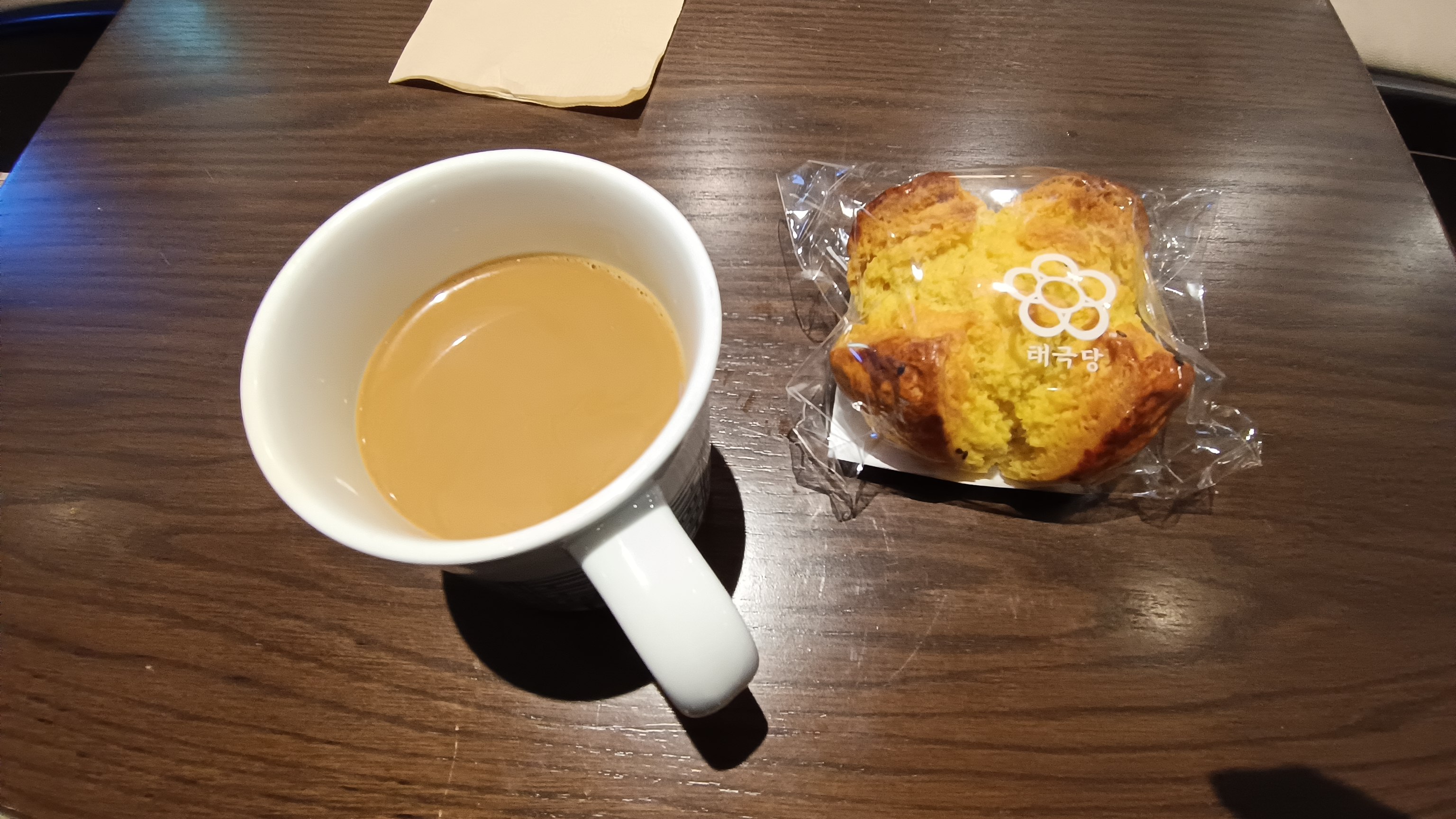 다른 카페에는 잘 없는 태극다방커피(3,000원)를 주문했다. 일행이 산 저 빵은 얼마인지 모르겠다.