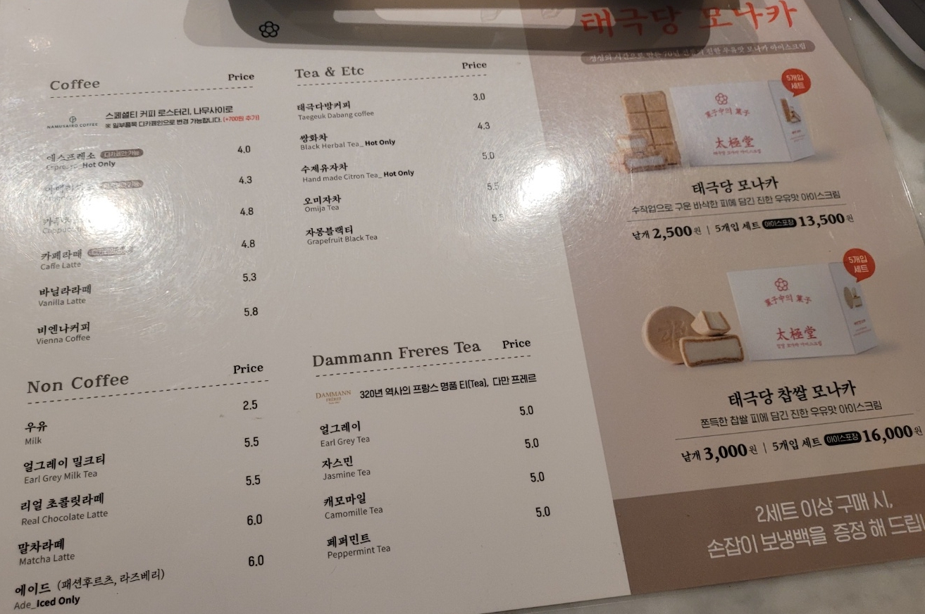 빵으로 유명한 태극당은 커피와 차도 판매한다. 가격은 적당한 편.