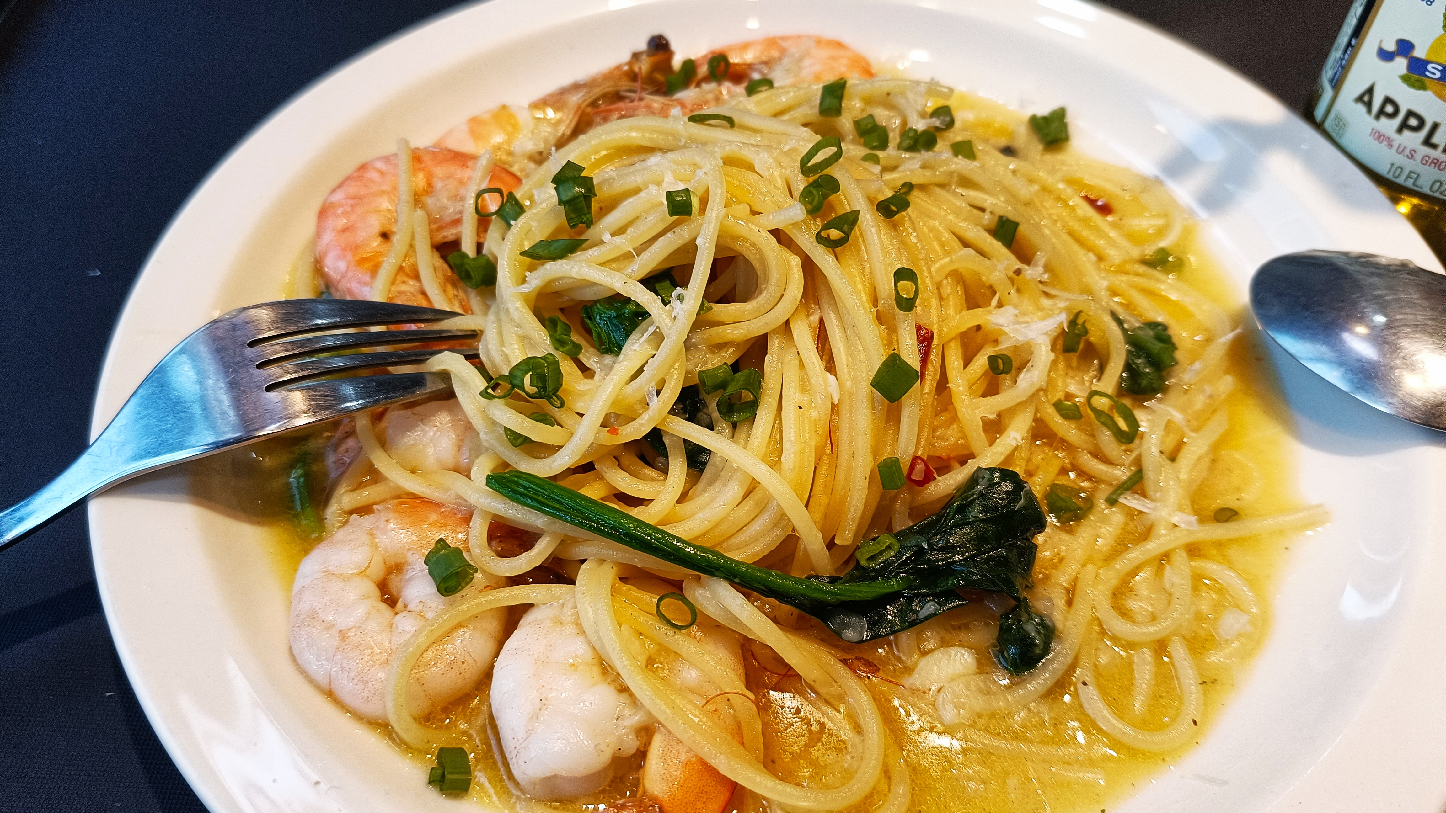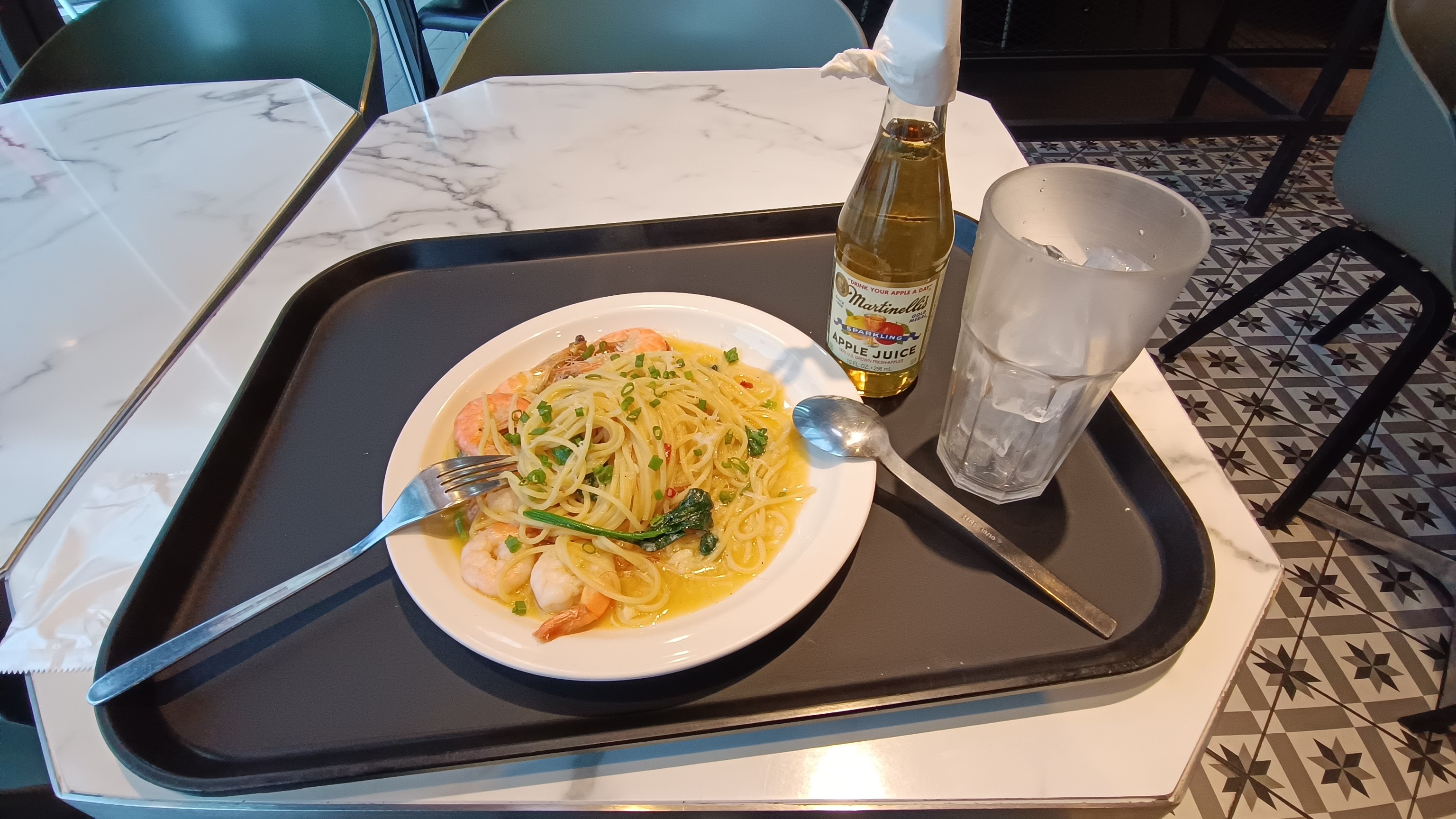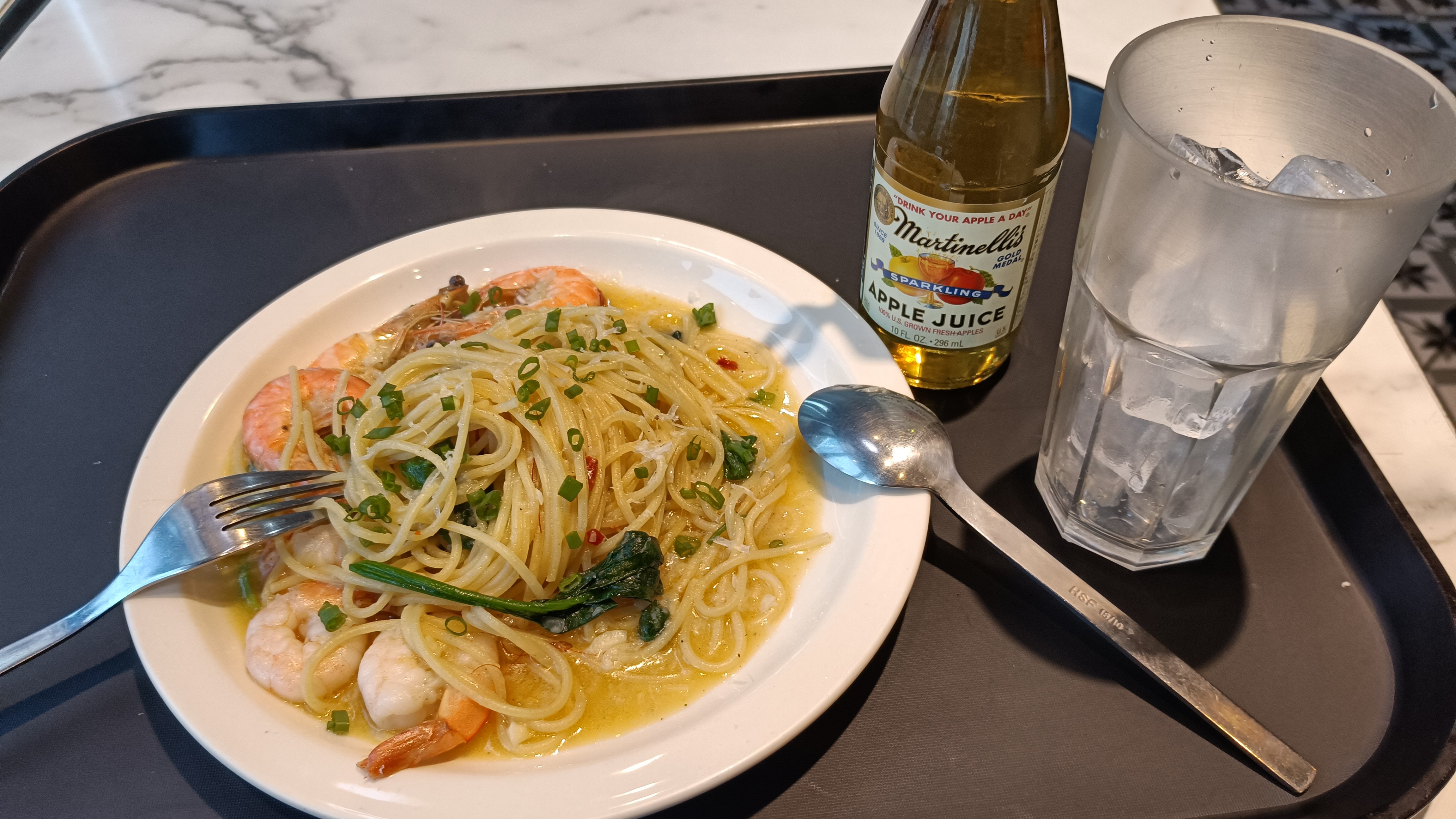 새우가 신선하고 파스타도 맛있었다. 애플쥬스는 기성품이고 얼음잔을 준다.