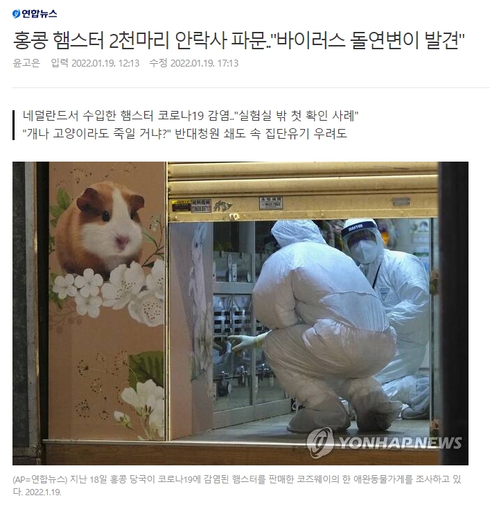 "홍콩 당국이 햄스터에서 사람으로 코로나19가 전파됐을 가능성을 의심하며 약 2천마리의 햄스터를 모두 안락사시키기로 한 파문이 커지고 있다. 성급하고 가혹한 결정이라며 이에 반대하는 청원이 쇄도하는 가운데, 한편에서는 공포 속 반려동물의 집단 유기가 발생할 것을 우려하고 있다. 또한 이번 사례와 관련해 채취한 바이러스에서는 일부 돌연변이가 발견돼 당국이 우려하고 있다."