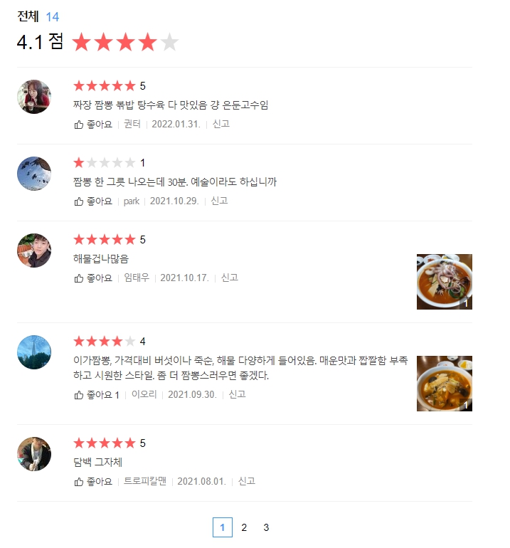 평점은 높은 편. 탕수육이 담백하고 맛있다에 동의한다. 나도 비슷한 평점을 주고 싶다.