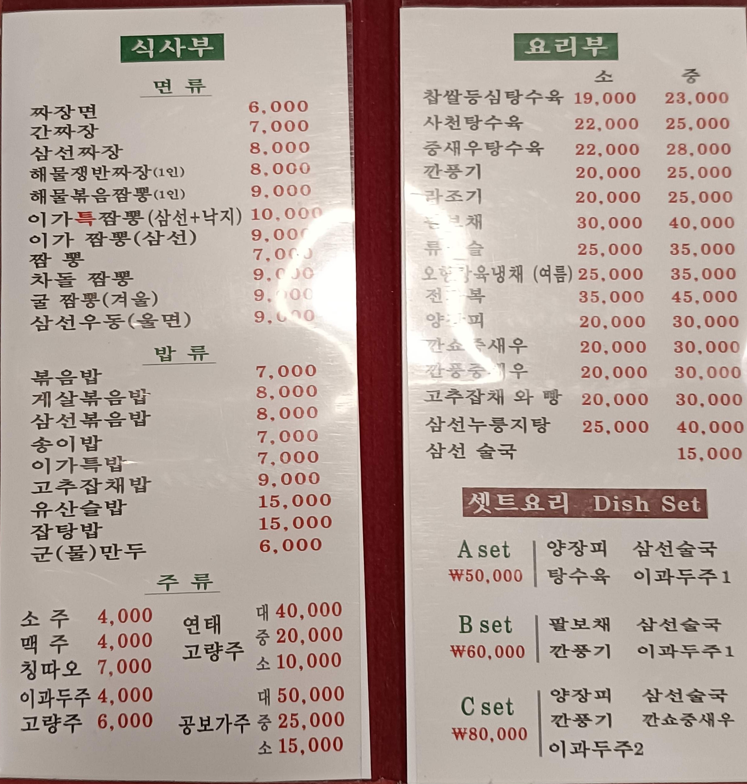 일반적인 중식 메뉴다. 이날 주문은 찹쌀등심탕수육 소 19,000원, 술은 공부가주 소 15,000원으로 시작, 이후 짜장면 6,000원과 이가짬뽕 9,000원 등을 시켰다.
