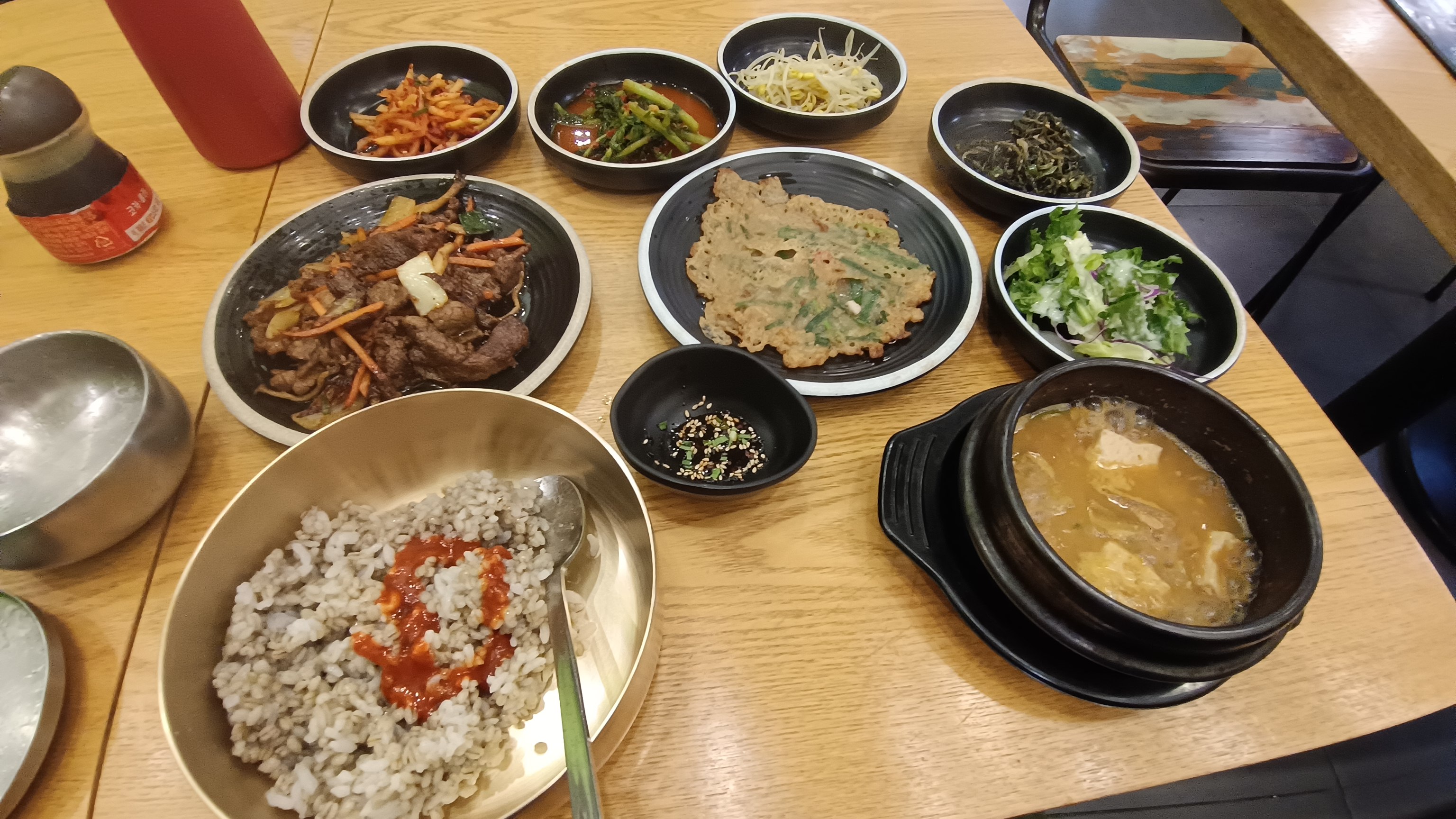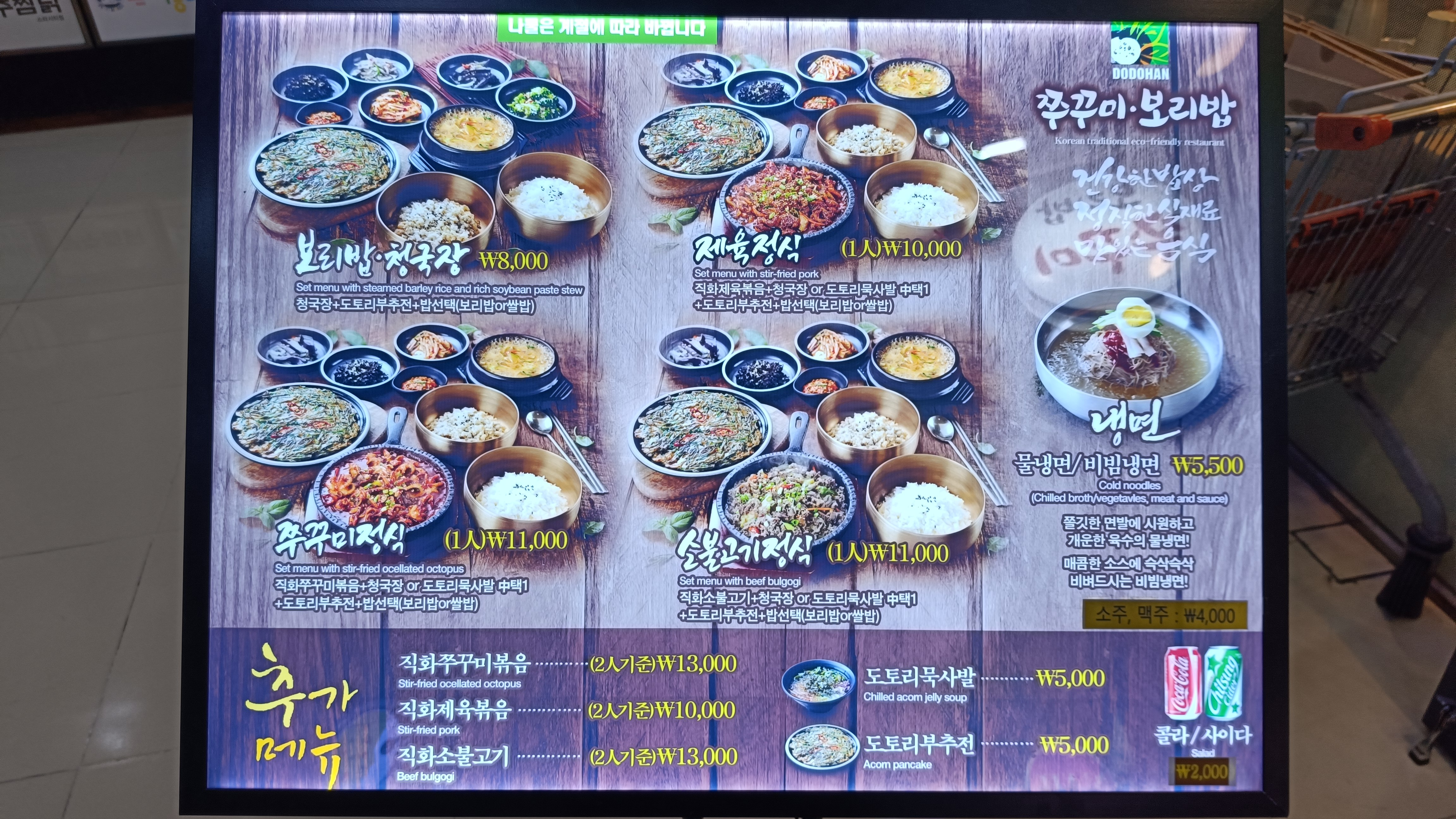 그 중 메뉴가 눈에 띈 이 집은 도도한쭈꾸미보리밥이라는 가게. 보리밥, 청국장, 부추전에 고기나 쭈꾸미 메인요리가 8,000원~11,000원에 사람도 북적인다. 그래서 결정했다.