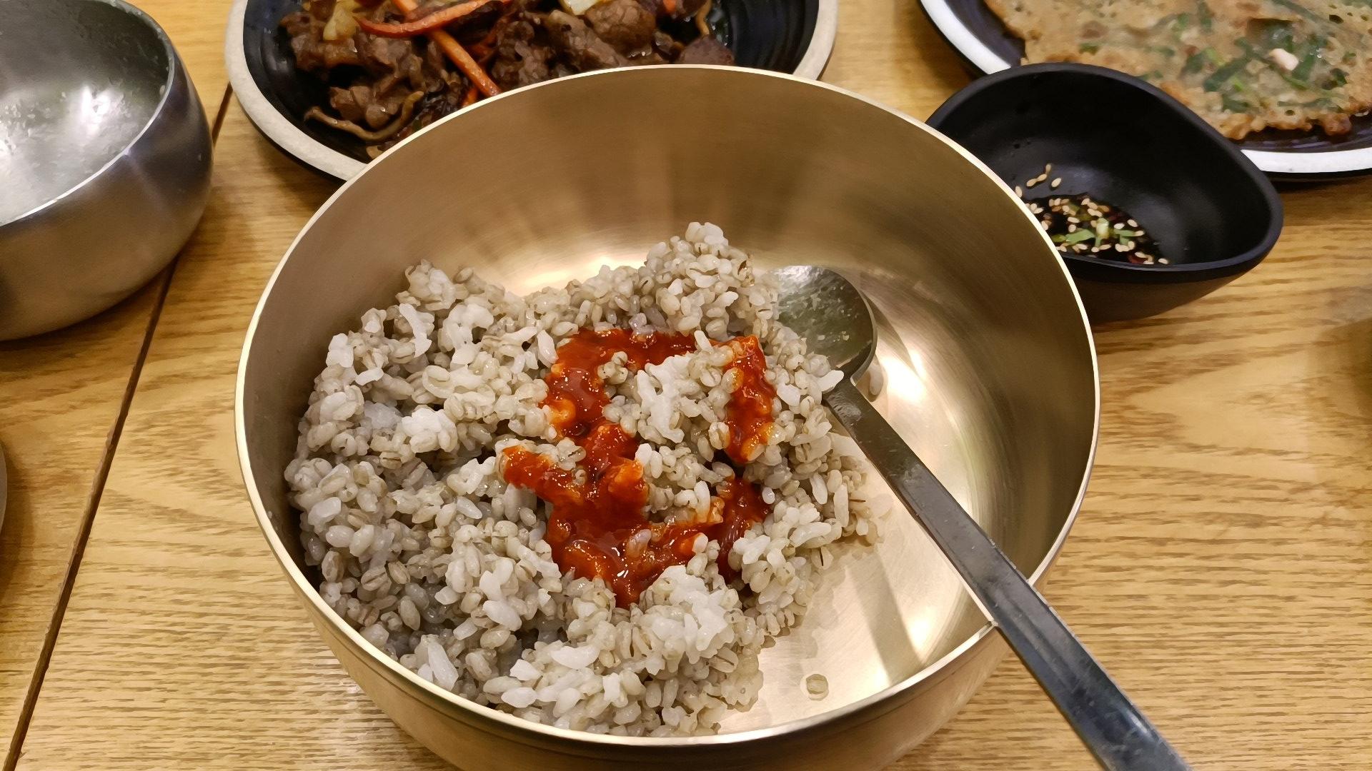 요렇게 나오면 공기밥 안에 보리밥을 덜어 비벼먹는 방식. 다른 테이블에서는 야채들을 넣어 같이 비벼먹는 사람도 있었다.