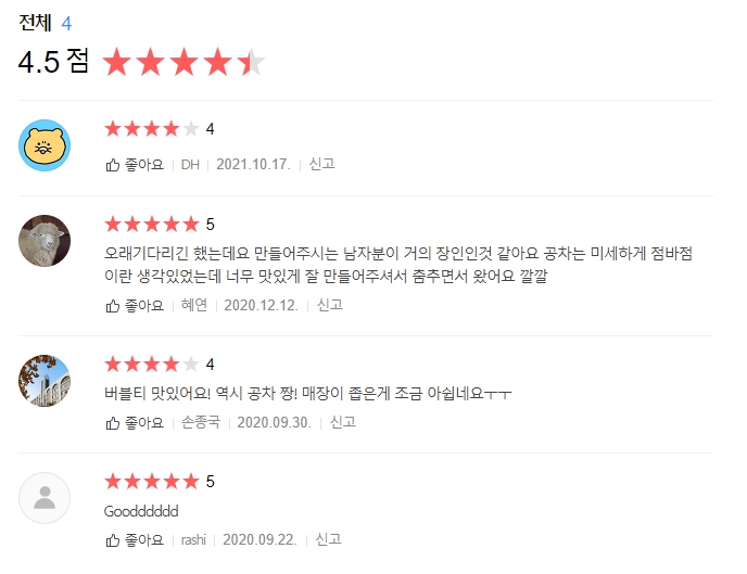 평점은 몇 명 안 되지만 높은 편. 알바 친구를 위한 점수일지도 모르지만, 공차는 괜찮은 가격과 맛을 제공하므로 이의 없다.