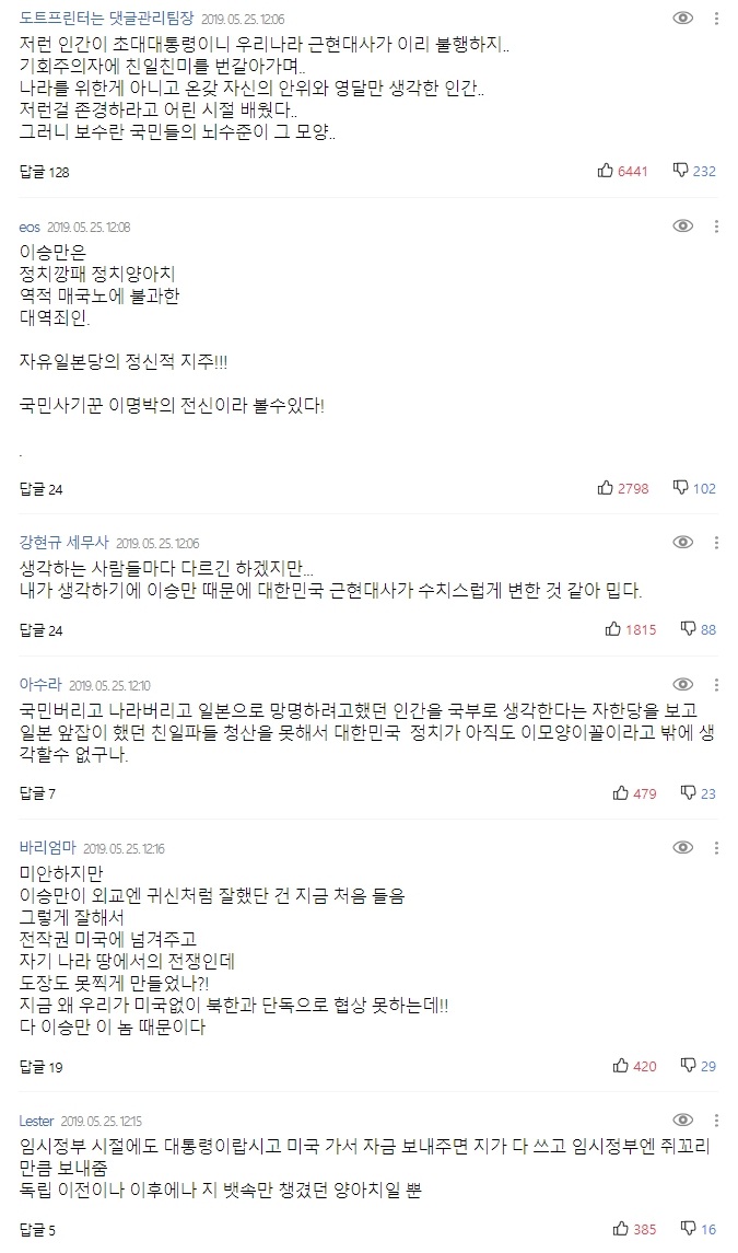 출처는 이 기사다. 이승만에 대한 평가는 댓글들이 정확히 말해주는 것 같다.