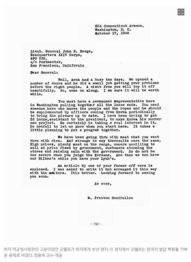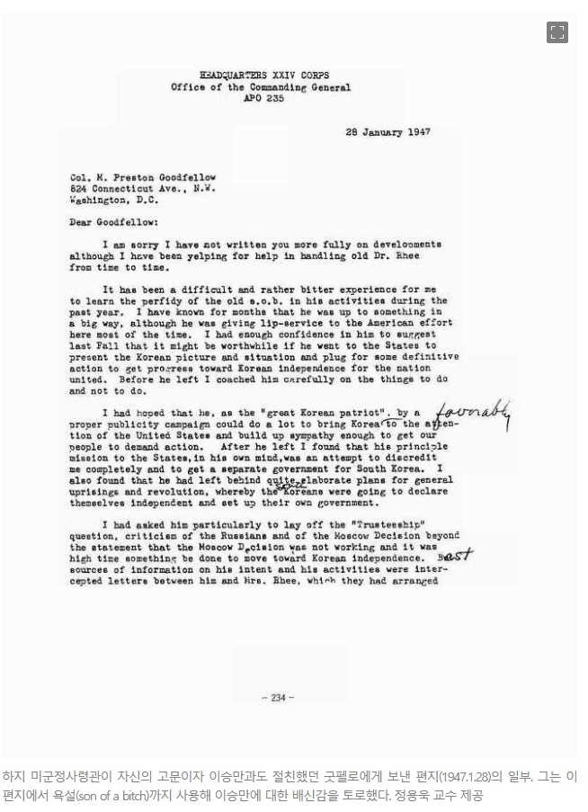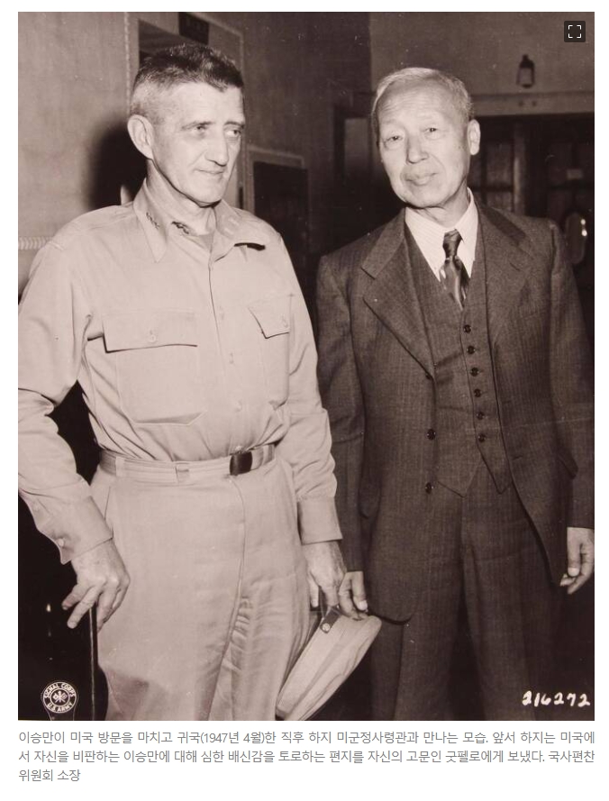 하지 장군이 자신의 정치고문이었고 이승만과도 친밀했던 굿펠로 대령에게 쓴 1947년 1월28일자 편지가 이와 관련해 하나의 실마리를 제공한다.