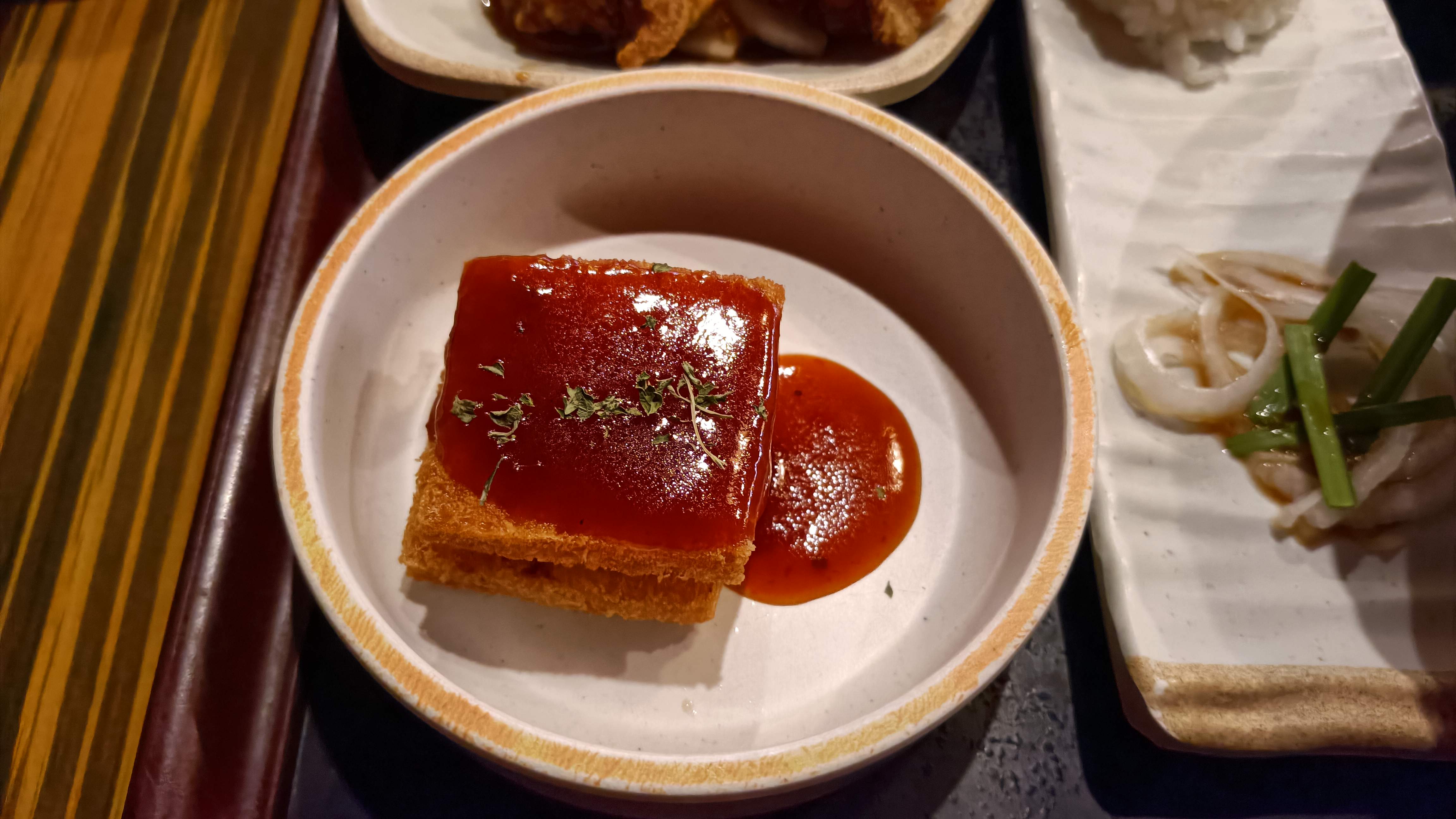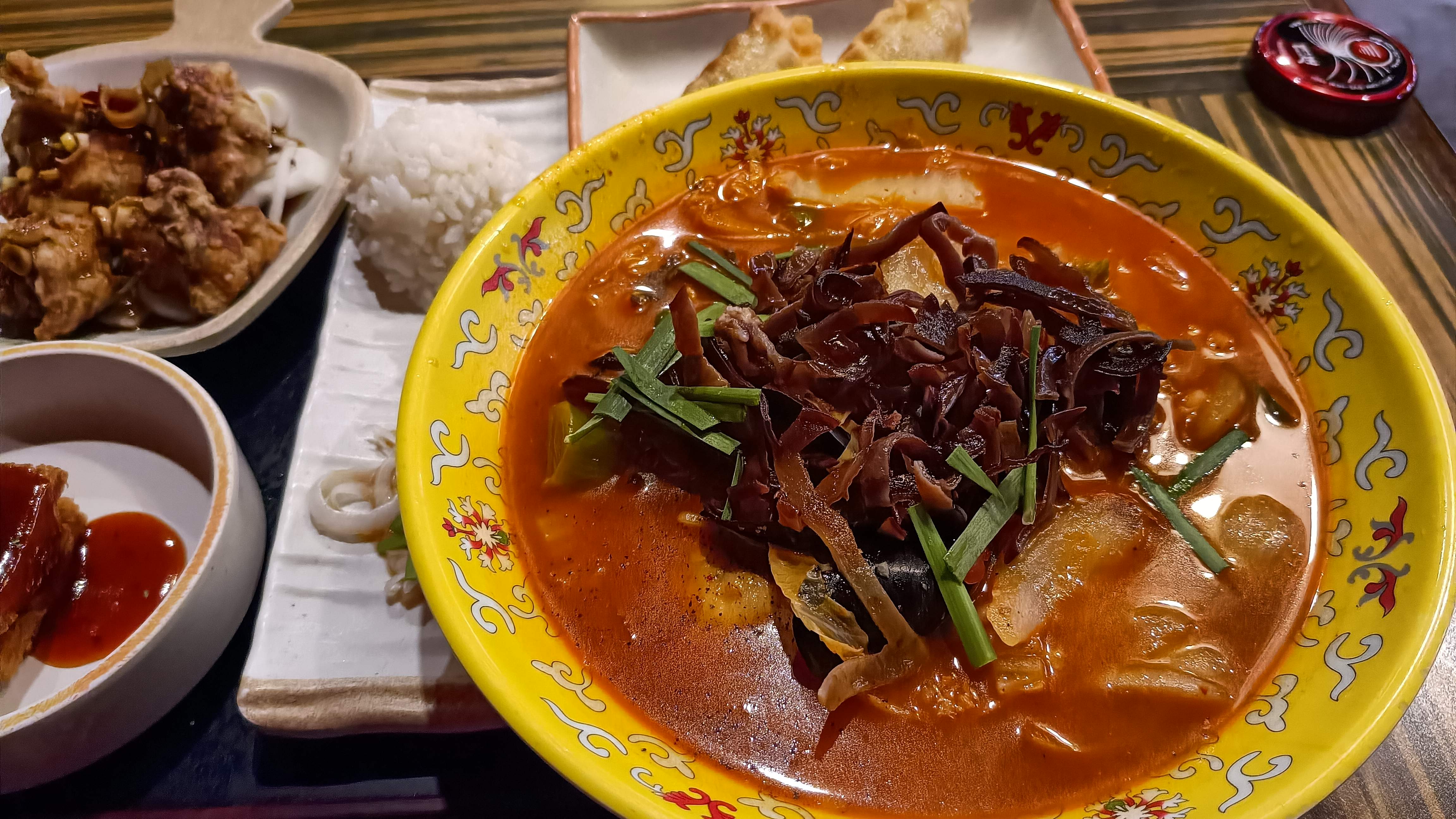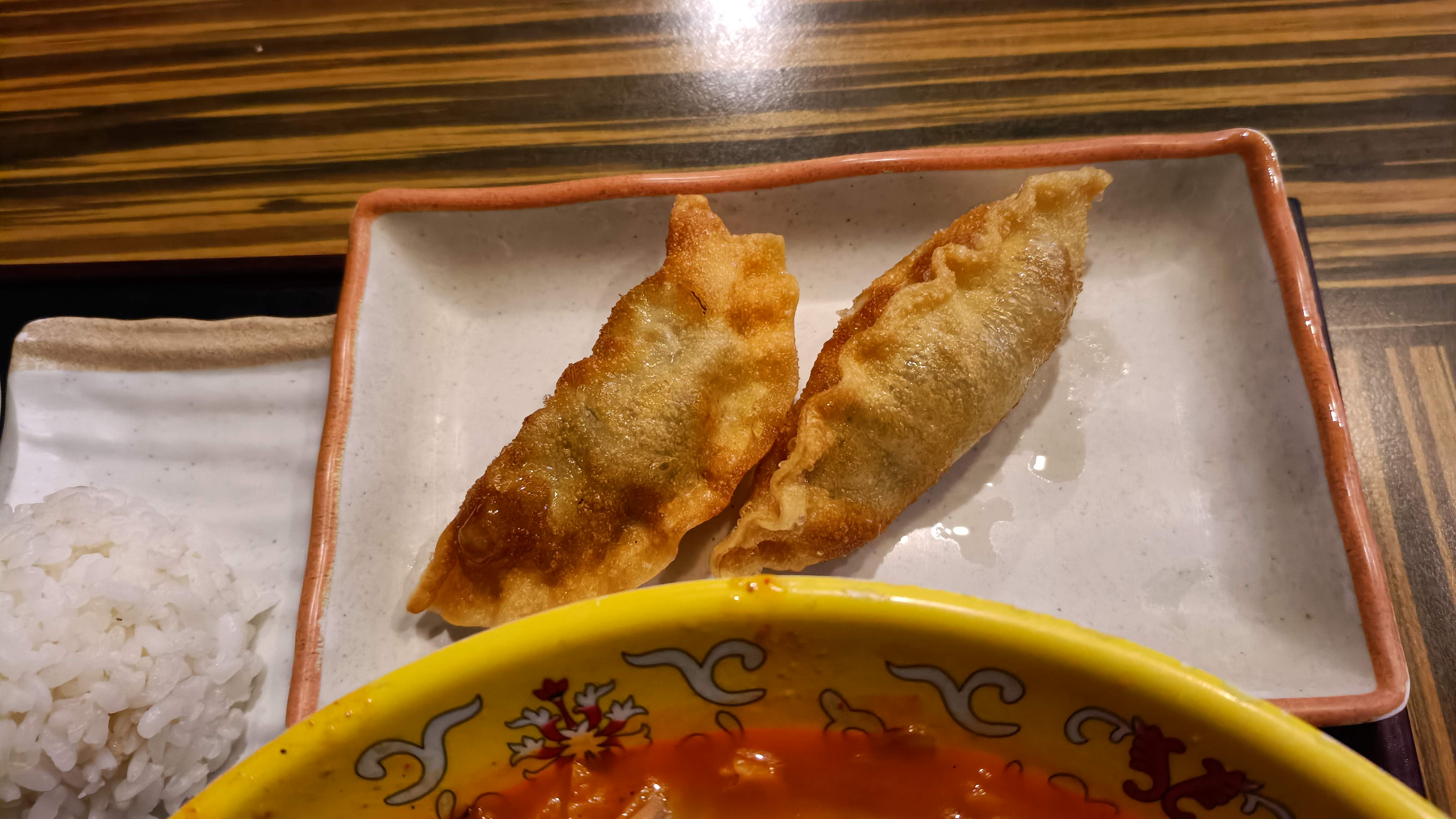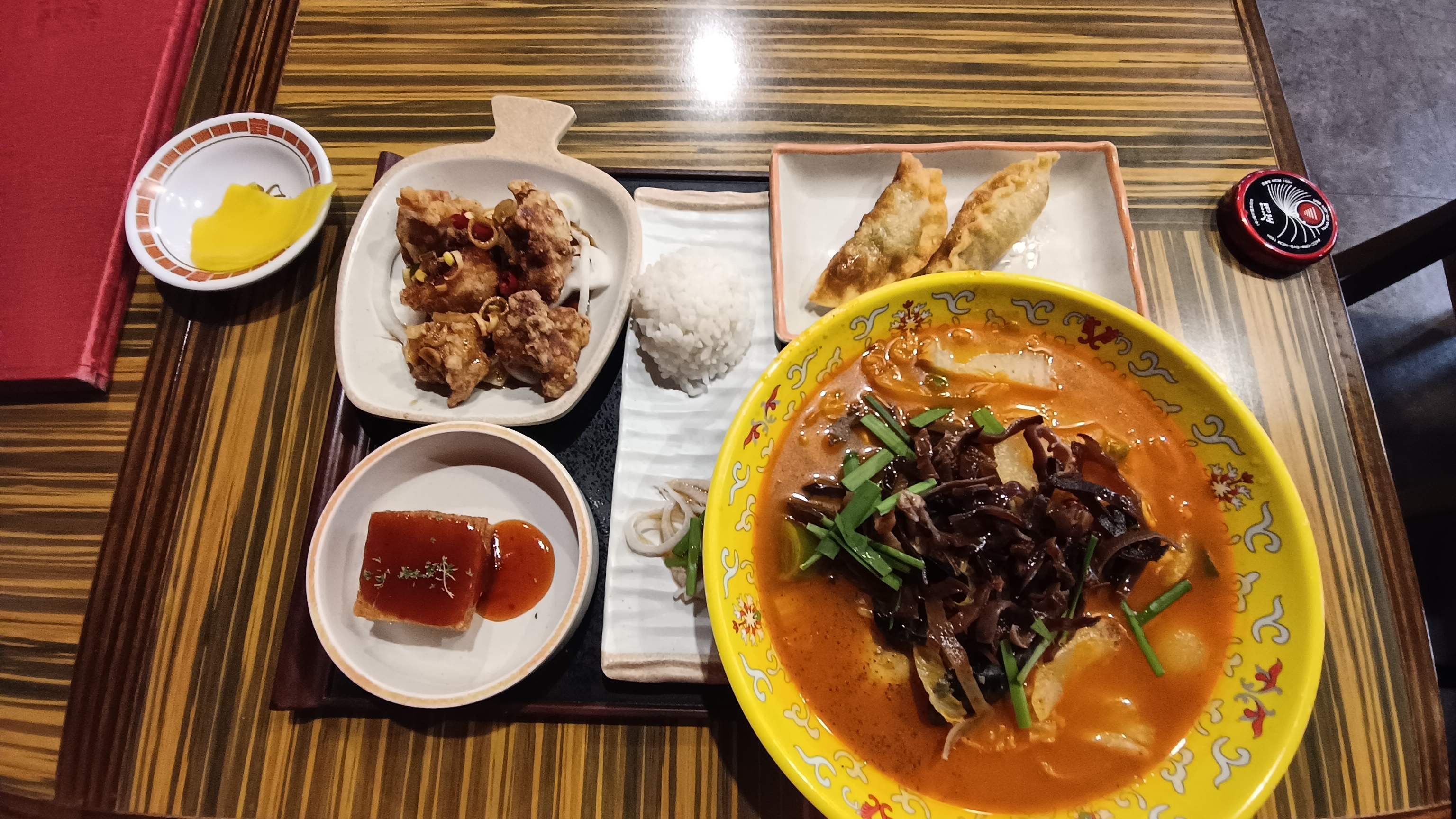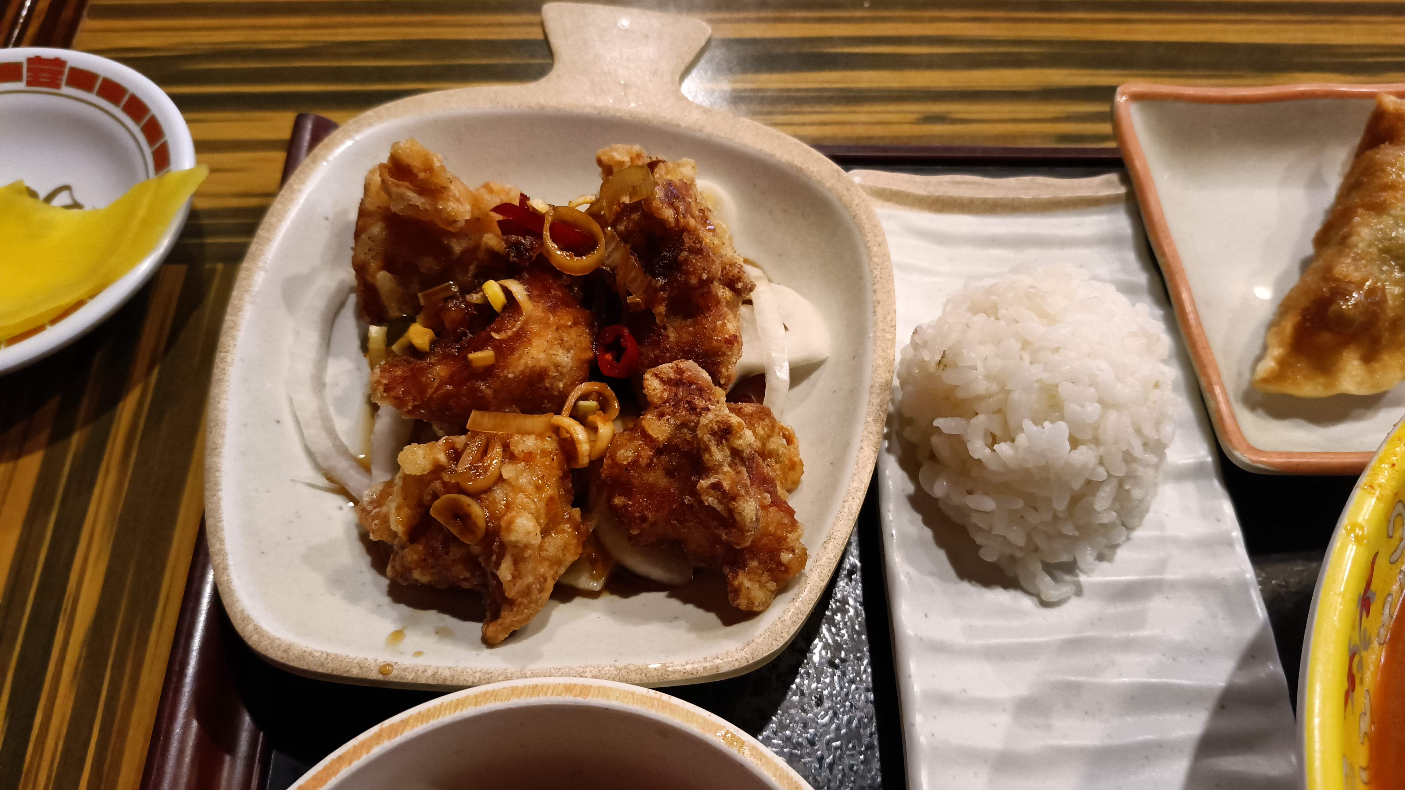 가정세트의 모습. 유린기, 군만두, 멘보샤가 곁들여 나온다.