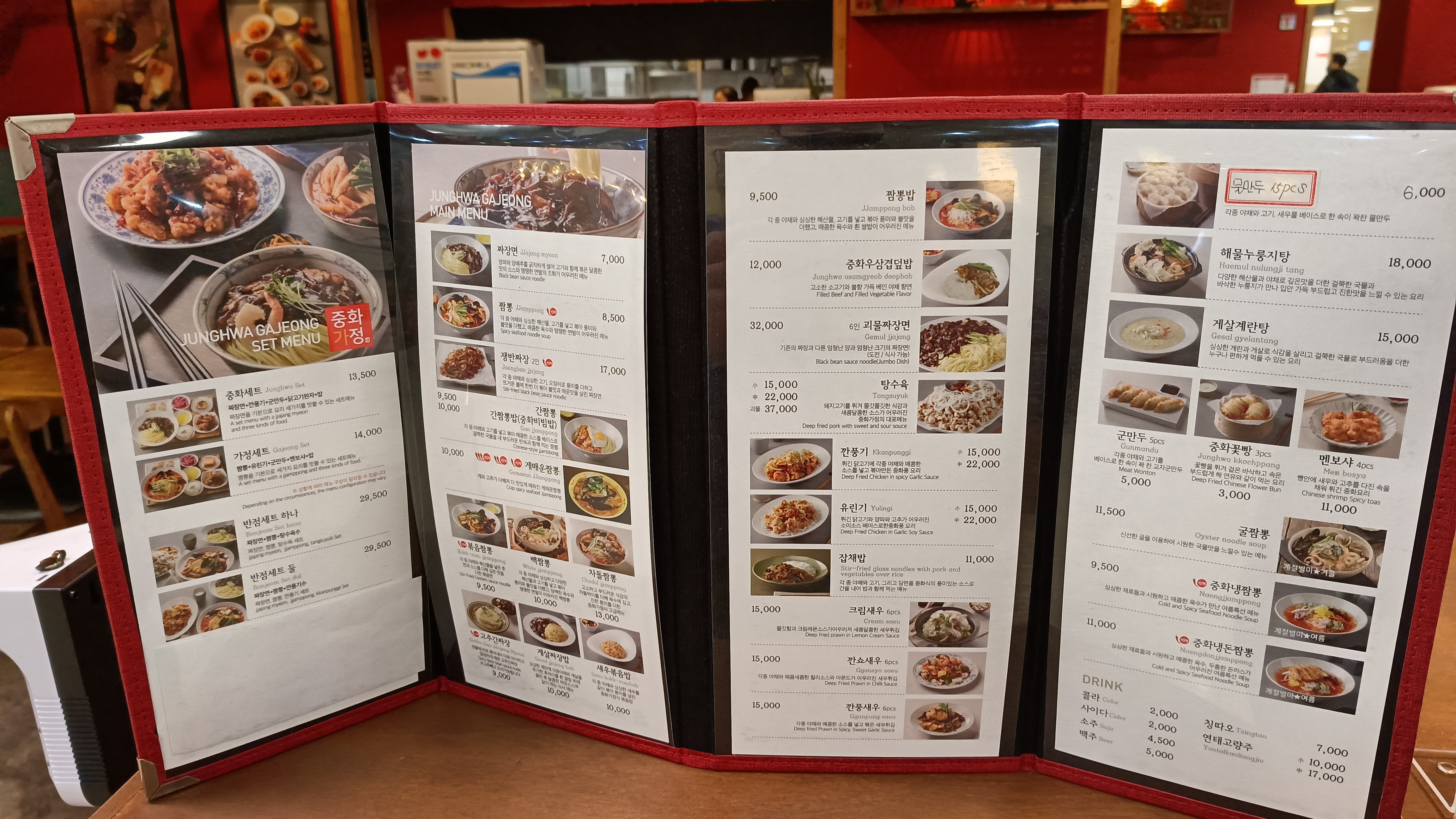 중화세트 13,500원, 가정세트 14,000원, 탕수육 소자 15,000원 정도가 눈에 띈다. 나는 매운걸 싫어하지만 이날은 느끼한게 꺼려져서 짬뽕이 주메뉴인 가정세트를 골랐다.