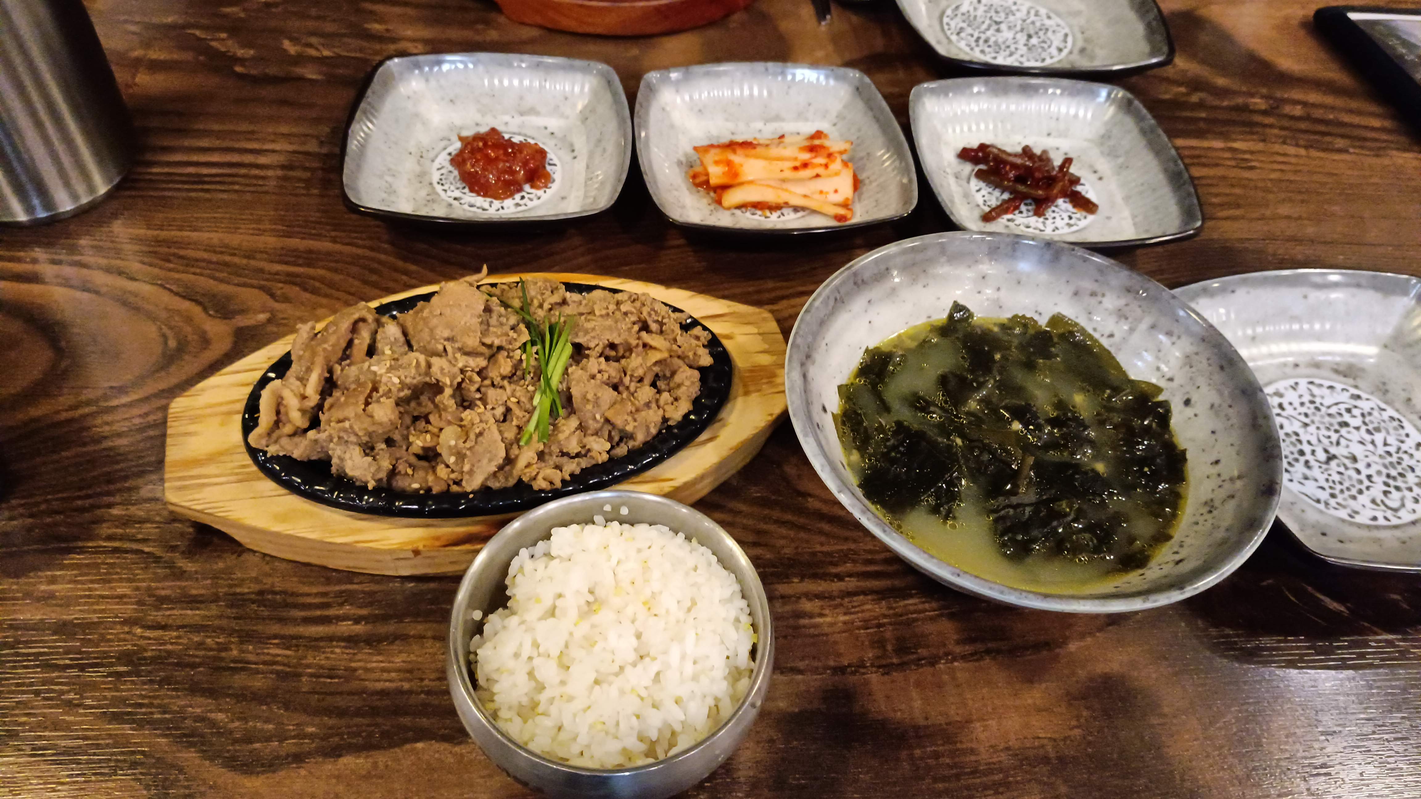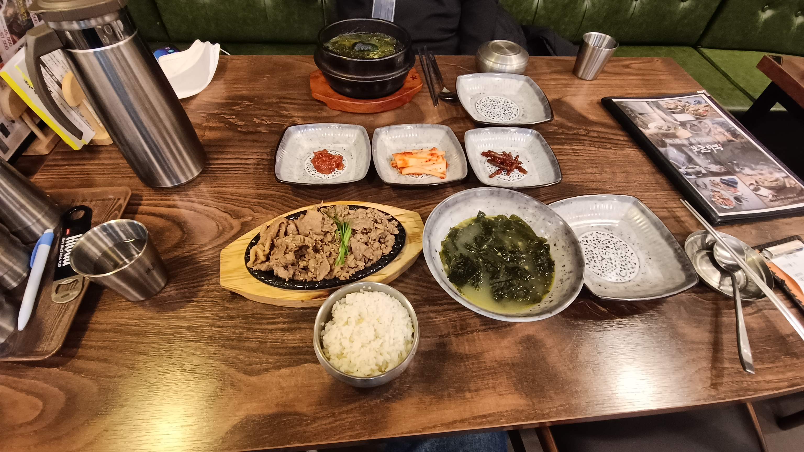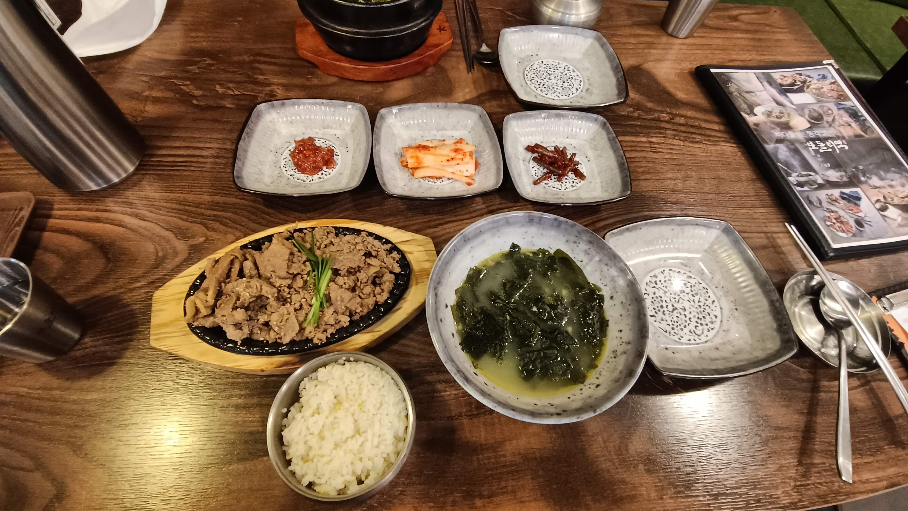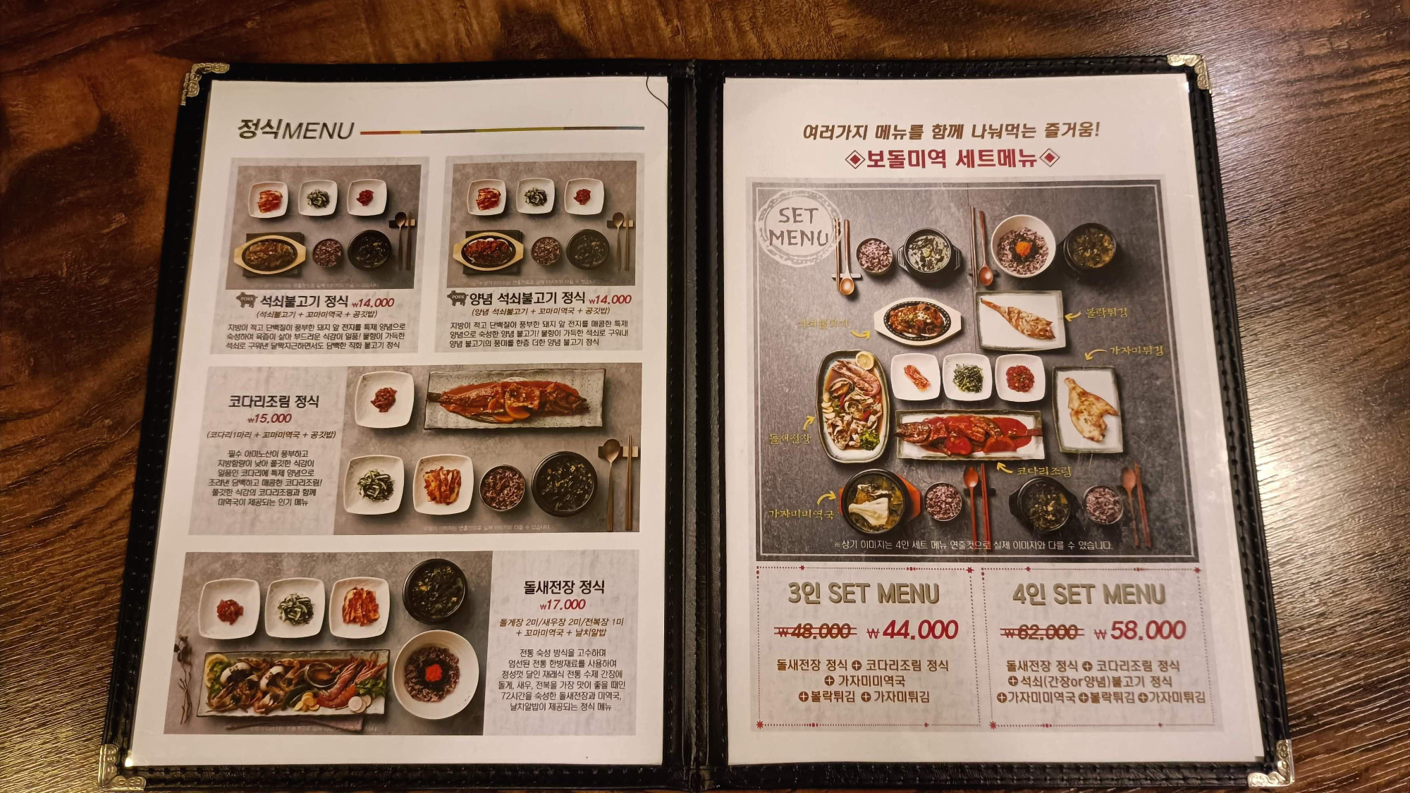 규모에 비해 메뉴가 많은 편. 배달도 많이 되는거 같았다. 가자미미역국 11,000원, 나는 석쇠불고기 정식 14,000원을 주문. 위치가 위치인지라 비싼 편이다.