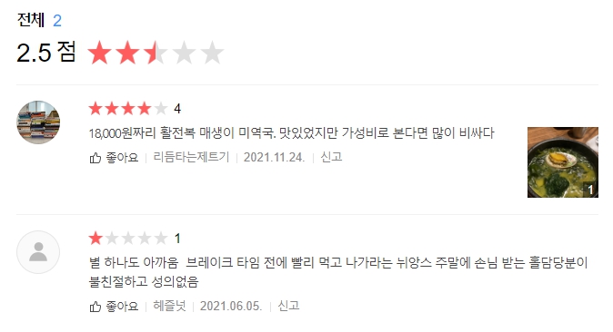 평점은 2명 뿐이고 낮은 편. 내 평점은 3.5점이다. 가격이 좀 낮았다면 4점을 줄 수 있다.