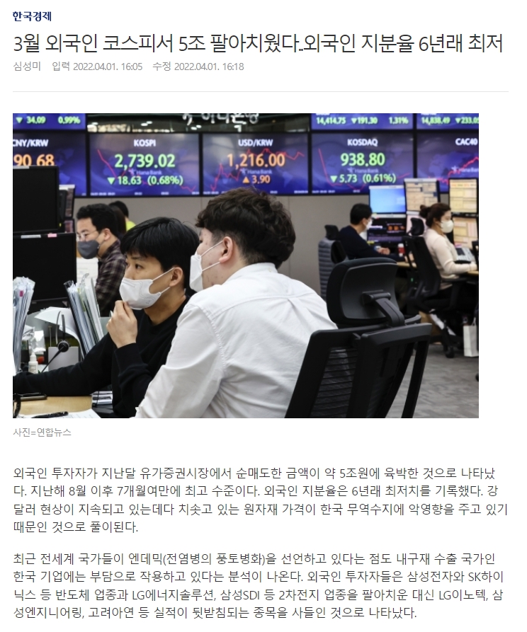 위대한 윤석열을 떠받드는 한경이 기사에서 여러가지 잡다한 이야기를 써놨지만 다 헛소리다. 미국이 금리를 올리면 한국은 더 올릴 수 밖에 없고 지금도 그러하니 환율때문에 외국인이 떠나는 것이 아니라 외국인이 떠나려고 원화를 팔아대니 환율이 오르는 것이다. 엔데믹이 되면 당연히 소비가 늘어날테니 수출국가들은 혜택을 입어야 한다. 기사는 거꾸로 쓰고 있다. 글로벌 1위에 최고 실적을 기록한 삼성전자를 파는 이유를 기사는 실적때문이라고 말하는 멍청함을 드러내고 있다. 기사 어디에도 지정학적 요인, 정치적 불안정성, 국가 전략의 부재를 말하고 있지 않다.