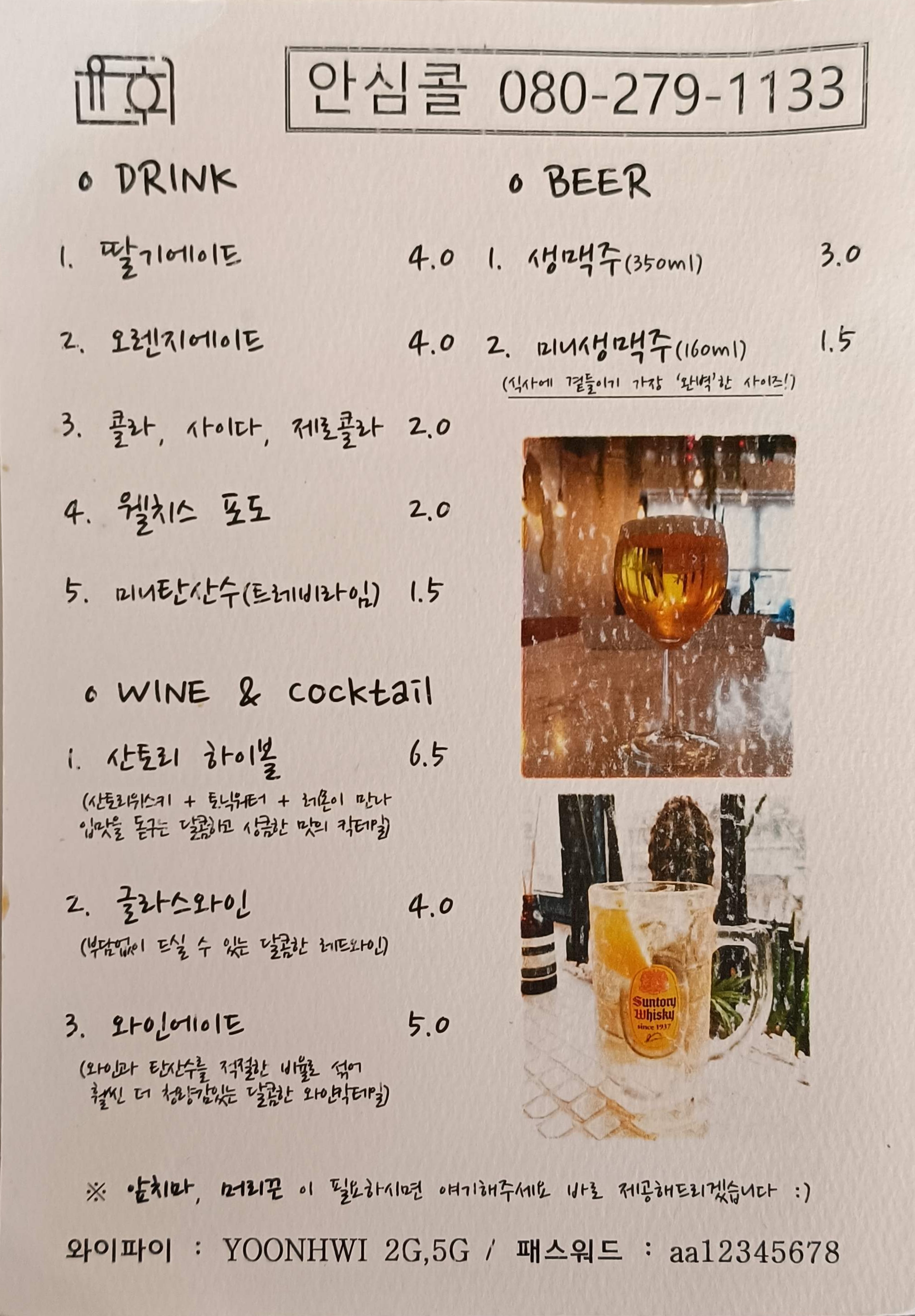 메뉴는 꽤 많은 편. 와인과 맥주도 판다. 메뉴 이름이 일본식 발음 그대로다.