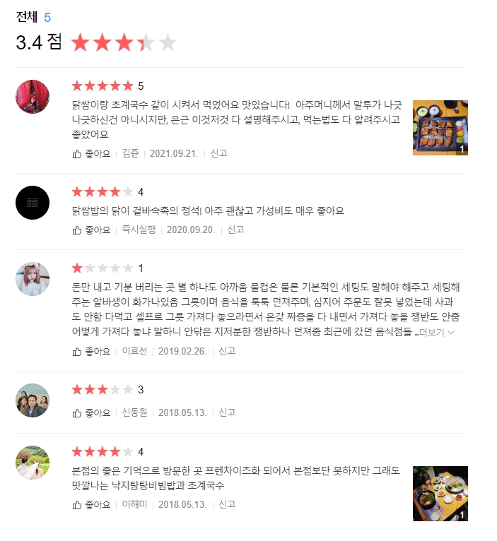 평점은 몇 개 안되지만 직원의 태도로 인한 별 1개를 제외하면 높은 편. 맛과 주차, 가격 등을 생각하면 나도 별 4개 정도는 주고 싶다.