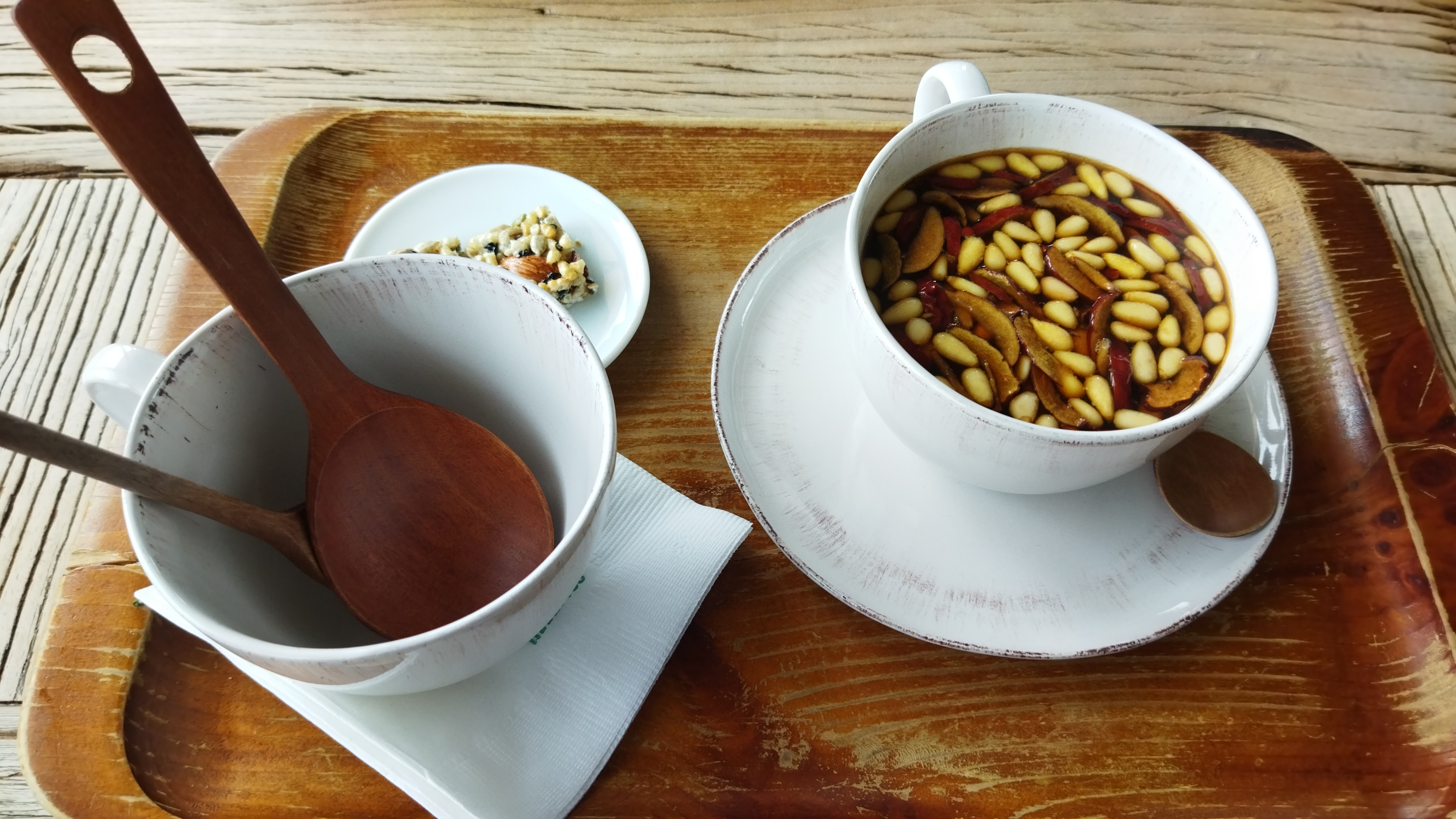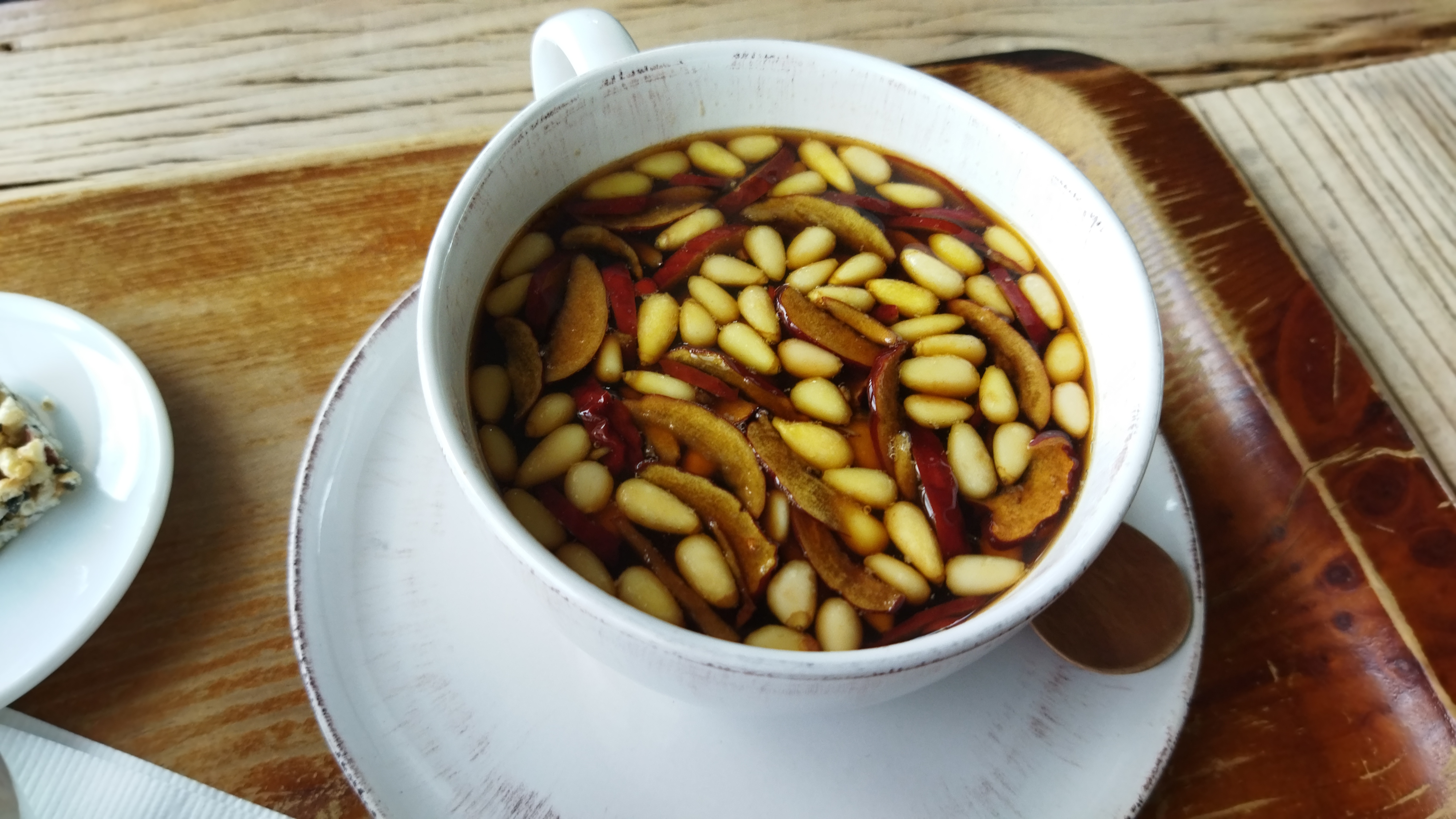 대추차에 알이 굵은 잣이 들어 있다.