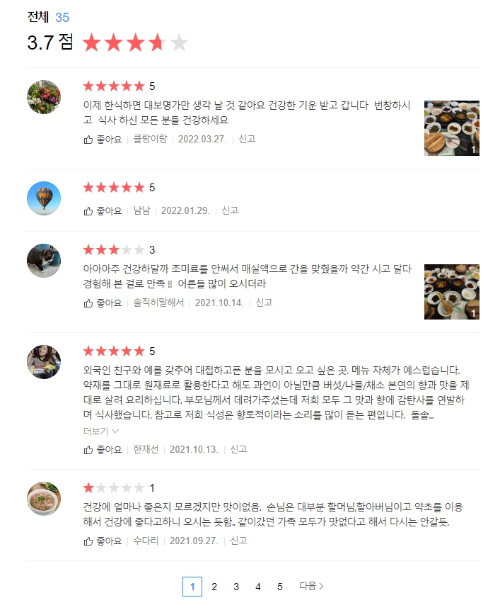 평점은 무난한 편. 1인당 18,000원이 싼 가격은 아니지만 경치와 주차의 편리성, 건강한 식재료와 조리 등을 생각하면 별점 4개가 내 평가다. 어르신을 모시고 오거나 한적하게 건강식을 즐기고 싶을때 생각이 날만한 좋은 곳이었다.