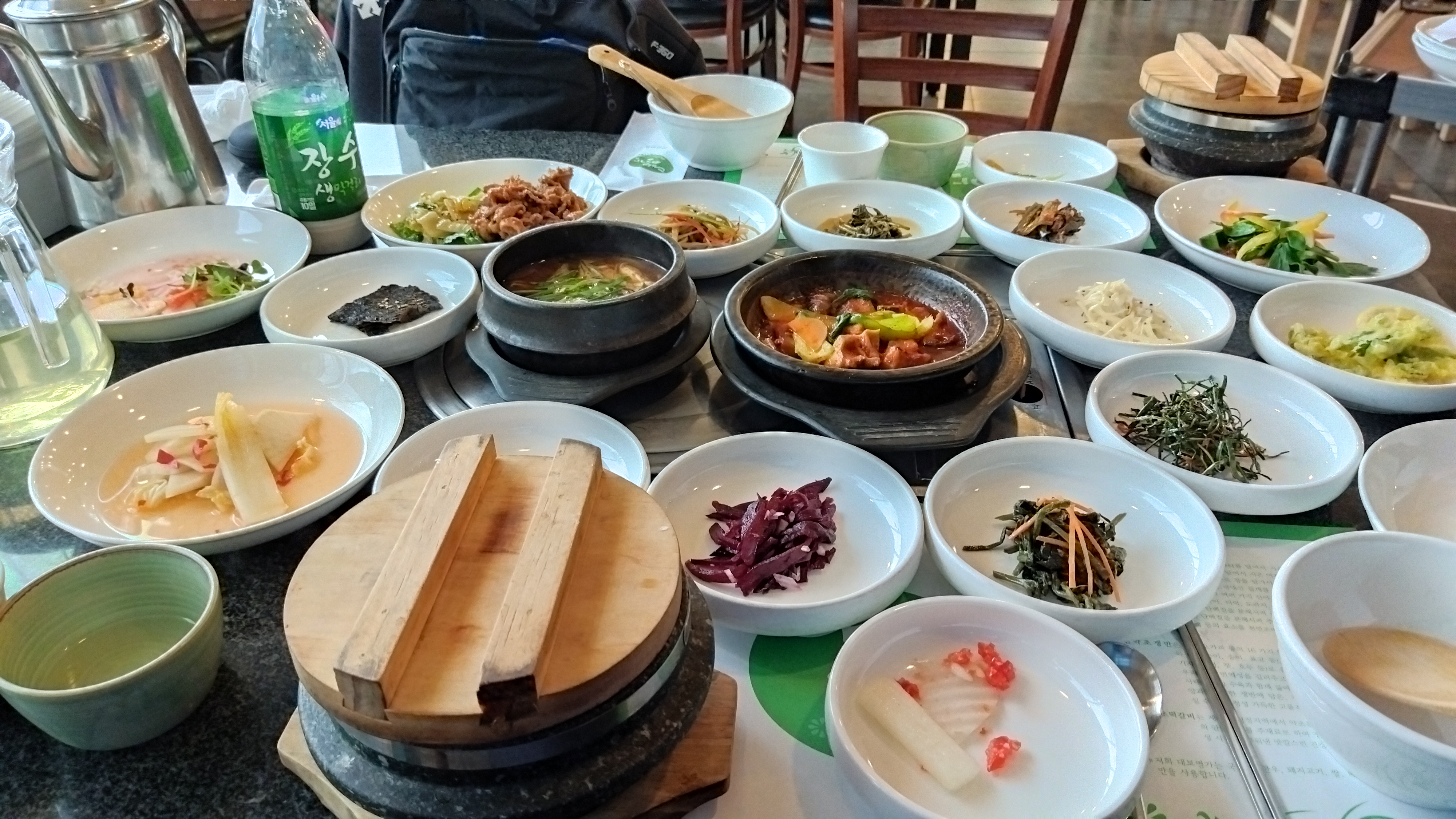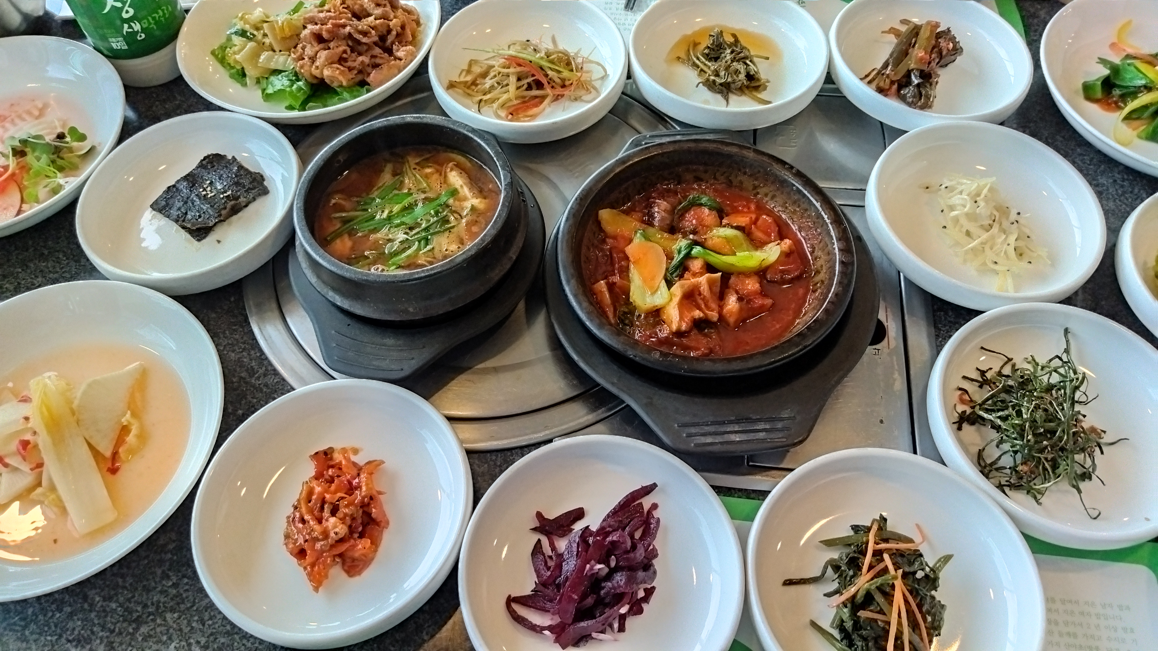 각종 나물에 된장찌게, 고기 등이 나오고 반찬은 무한리필이다.