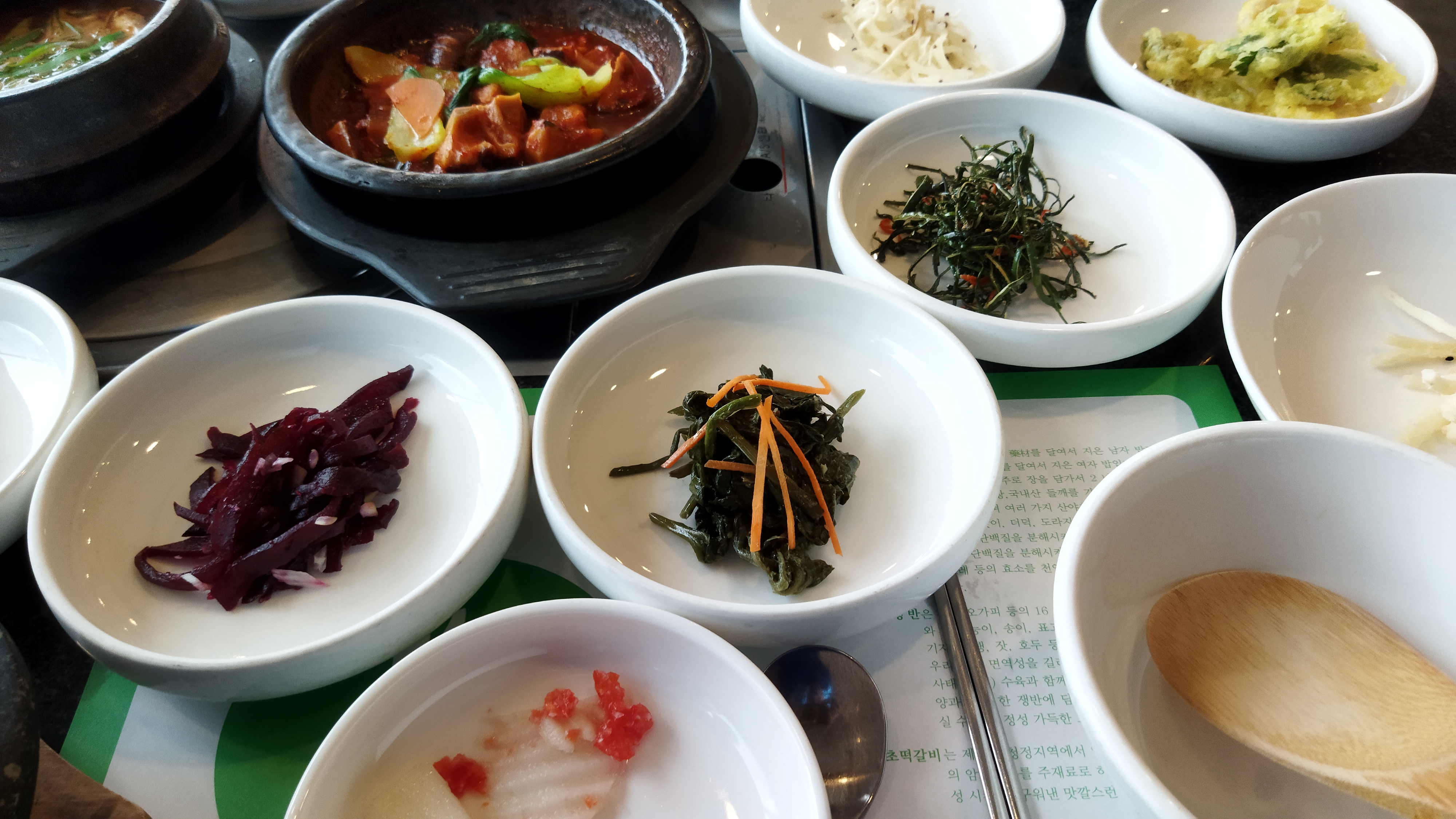 반찬은 종류가 많아 다 먹지도 못했다.