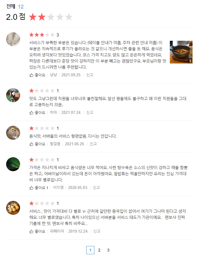평점은 생각보다 많이 낮은 편. 위치, 주차의 편리성, 맛 등을 종합하면 좀 비싼 편이긴 하지만 개인적으로는 3.5~4개 정도의 평점이다. 이 정도 가격에 주차하고 룸에서 조용히 식사할 수 있는 곳이 그리 많지는 않기 때문이다. 서비스도 만족스러웠다.