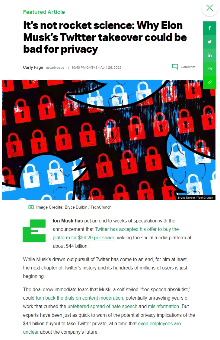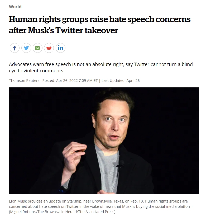 테슬라의 트위터 인수에 환호하는 사람들이 대부분이었겠지만 나는 이상했다. AOL과 타임워너와의 합병은 당시 거대 온라인회사와 미디어회사와의 결합으로 납득이 충분히 가능하다. 그러나 테슬라의 트위터 인수는 사실 엘론 머스크 개인의 욕망이라는 생각밖에 들지 않는다. 이 글이 나의 그런 생각을 정확히 뒷받침해준다. 이 글은 엘론 머스크를 표현의 자유 절대주의자(신봉자)라고 표현하며 헤이트 스피치와 거짓 정보, 가짜 뉴스의 범람을 우려하고 있다.