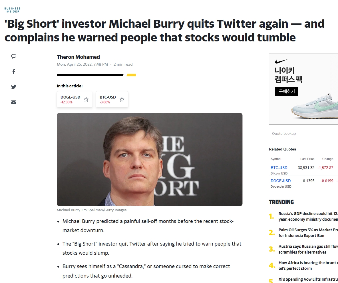 | 빅쇼트 주인공 마이클 버리가 5월 갑자기 많은 경고를 쏟아내고 있다. 시장의 급락이 곧 시작될 수 있다. (0) | 2022.05.25 |