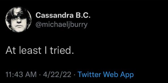 "적어도 나는 노력했다. (주식시장 폭락이 올거라 당신들에게 경고해주기 위해)" 그는 근래 수차례에 걸쳐 캐쉬우드 펀드의 위험성과 시장의 급락에 대해 경고해 왔다. 그러나 양적완화에 취해 있는 시장은 내일이면 오를거야라는 자세로 그의 말을 듣지 않고 있다. 2008년에도 그랬고 지금도 사람들은 상승만을 바라보고 있는 반면 그를 비롯한 소수는 2022년에도 주식시장의 폭락을 경고하고 있다. 나는 그의 의견에 동의한다. 더군다나, 나는 미국의 돈풀기와 인플레 방조는 결국 중국을 잡기위한 포석으로 보고 있기 때문에 더욱 그렇다. 지금 중국이 처한 상황에서 미국의 금리인상과 앞으로 전개될지도 모를 경제제재는 그들에게 재앙이 될 수도 있다. 한국은 위대한 지도자 윤석열과 조선상남자집단 국민의힘이 그런 국제정세를 잘 읽고 영웅적으로 대처할 것이라 믿어 의심치 않는다. 어쩌면 당장 올해부터 내년까지만 봐도 코스피 1000마저도 위험해질지도 모른다.