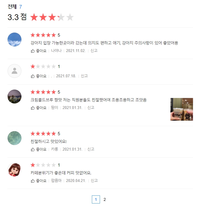 평점은 보통 수준. 내 평점은 3.5점이다. 커피맛은 평범하지만 주차지원에 테라스, 펫까지 생각하면 4점도 가능하다.