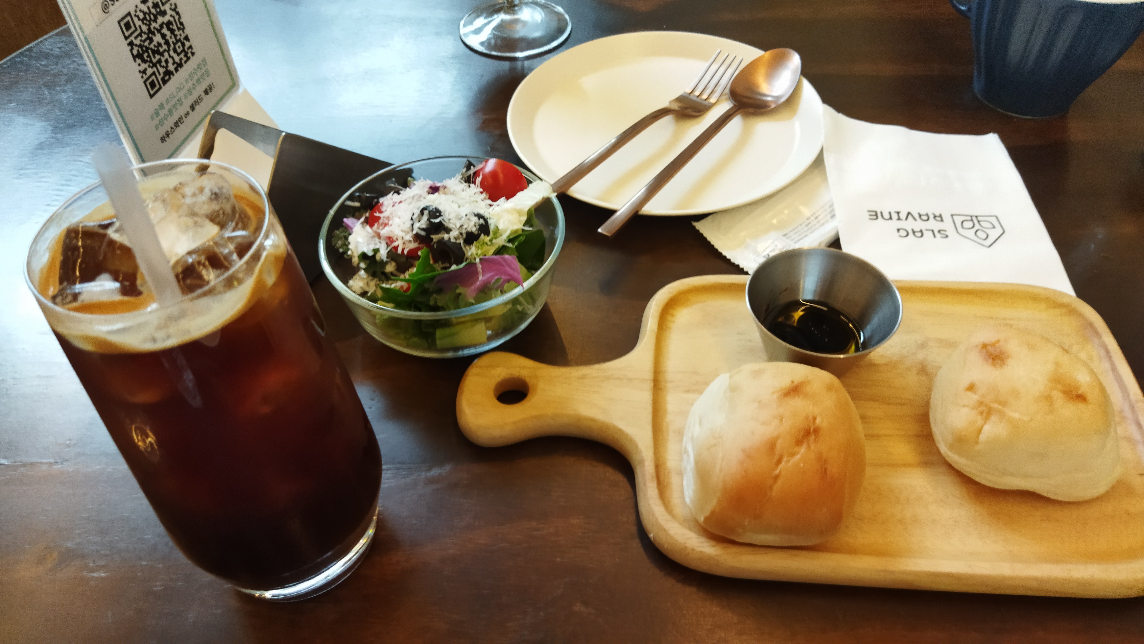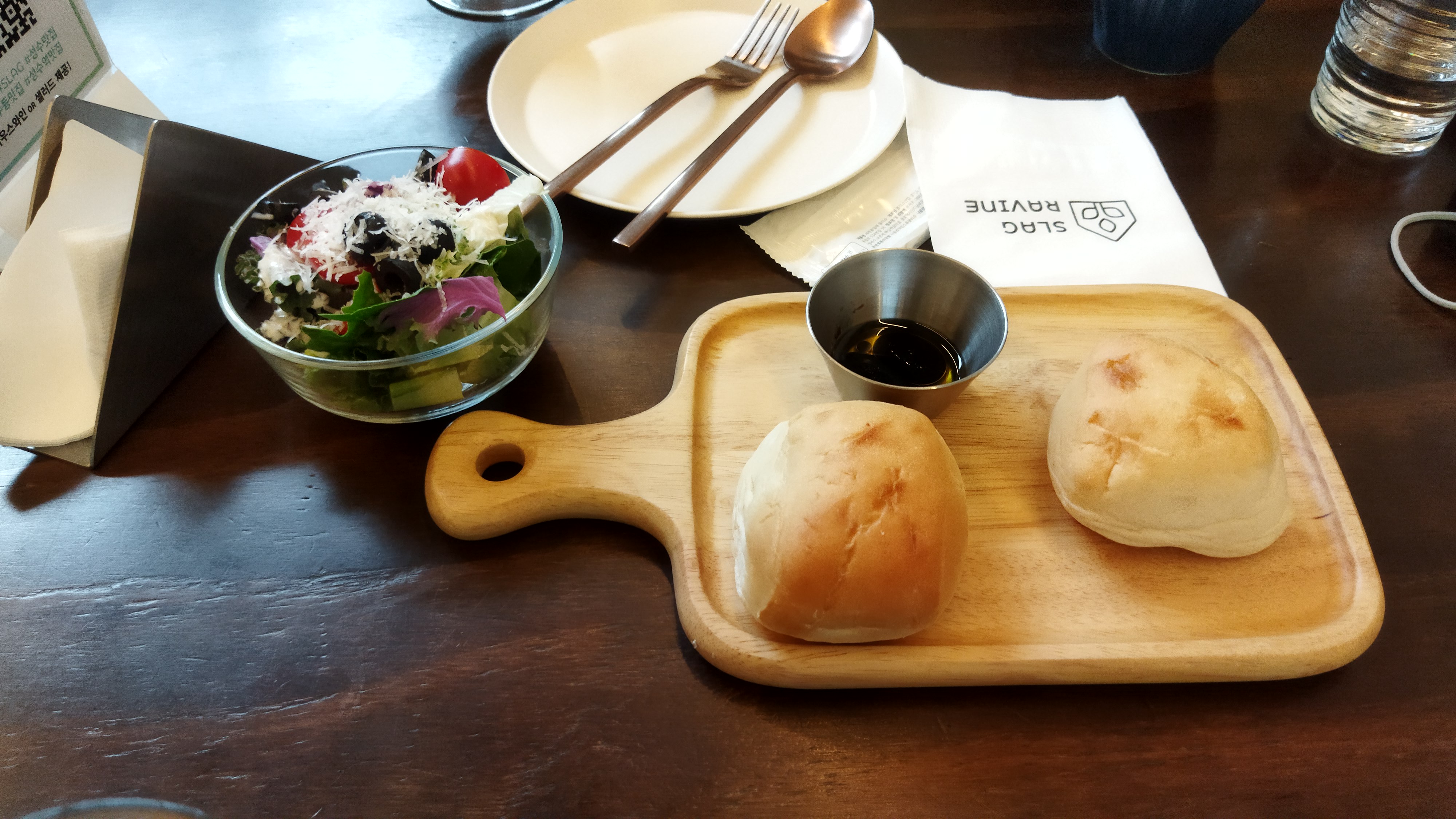 파스타를 시키니 식전빵을 준다. 샐러드와 아메리카노 세트 4,900원짜리를 주문했더니 샐러드도 함께 나왔다.