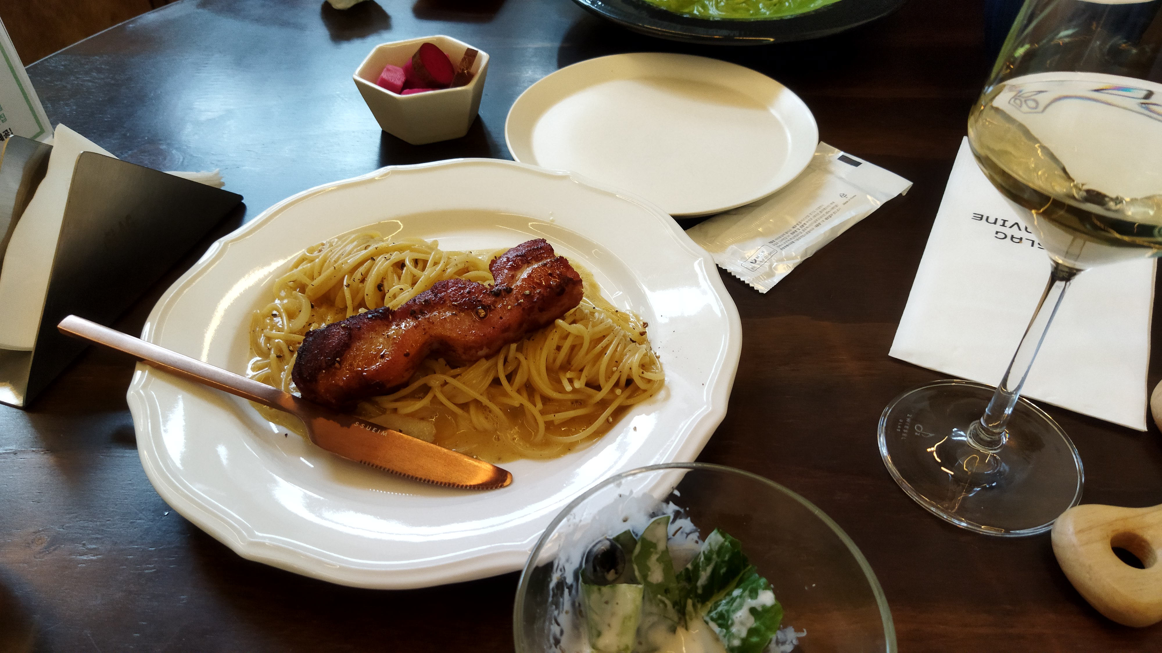 베이컨 파스타 17,000원. 샐러드, 파스타 모드 신선한 재료를 쓰는 것 같았고 맛도 있었다. 가격도 괜찮은 편이다.