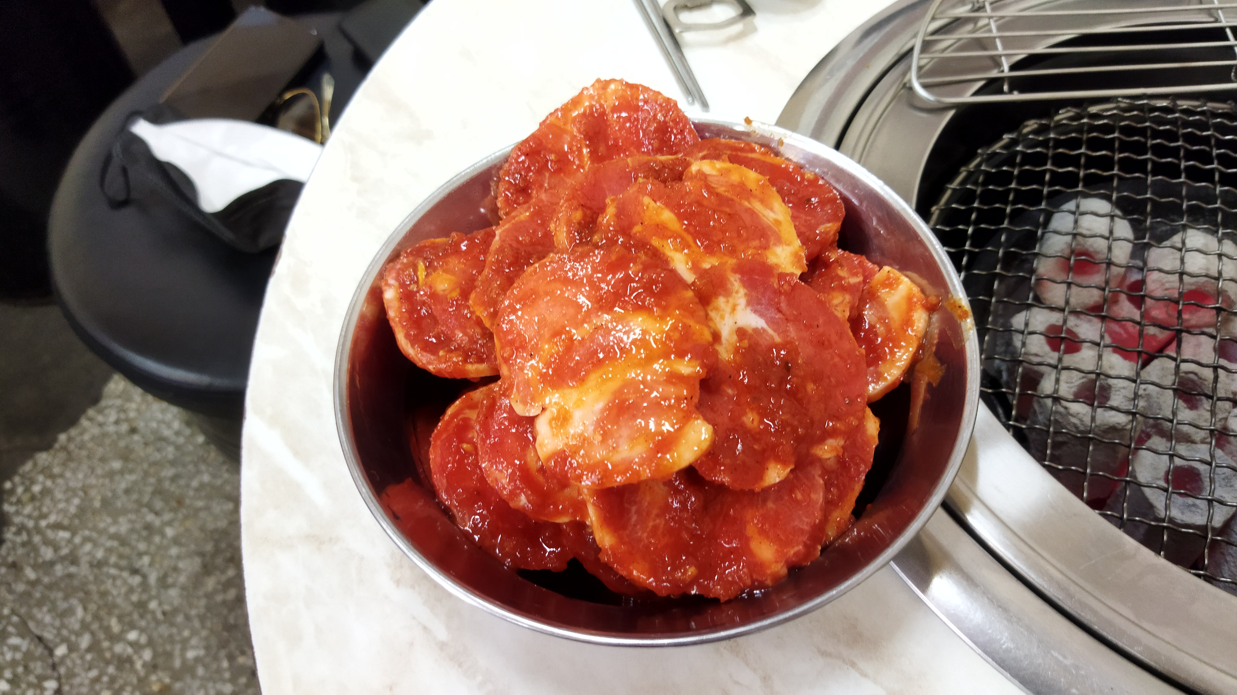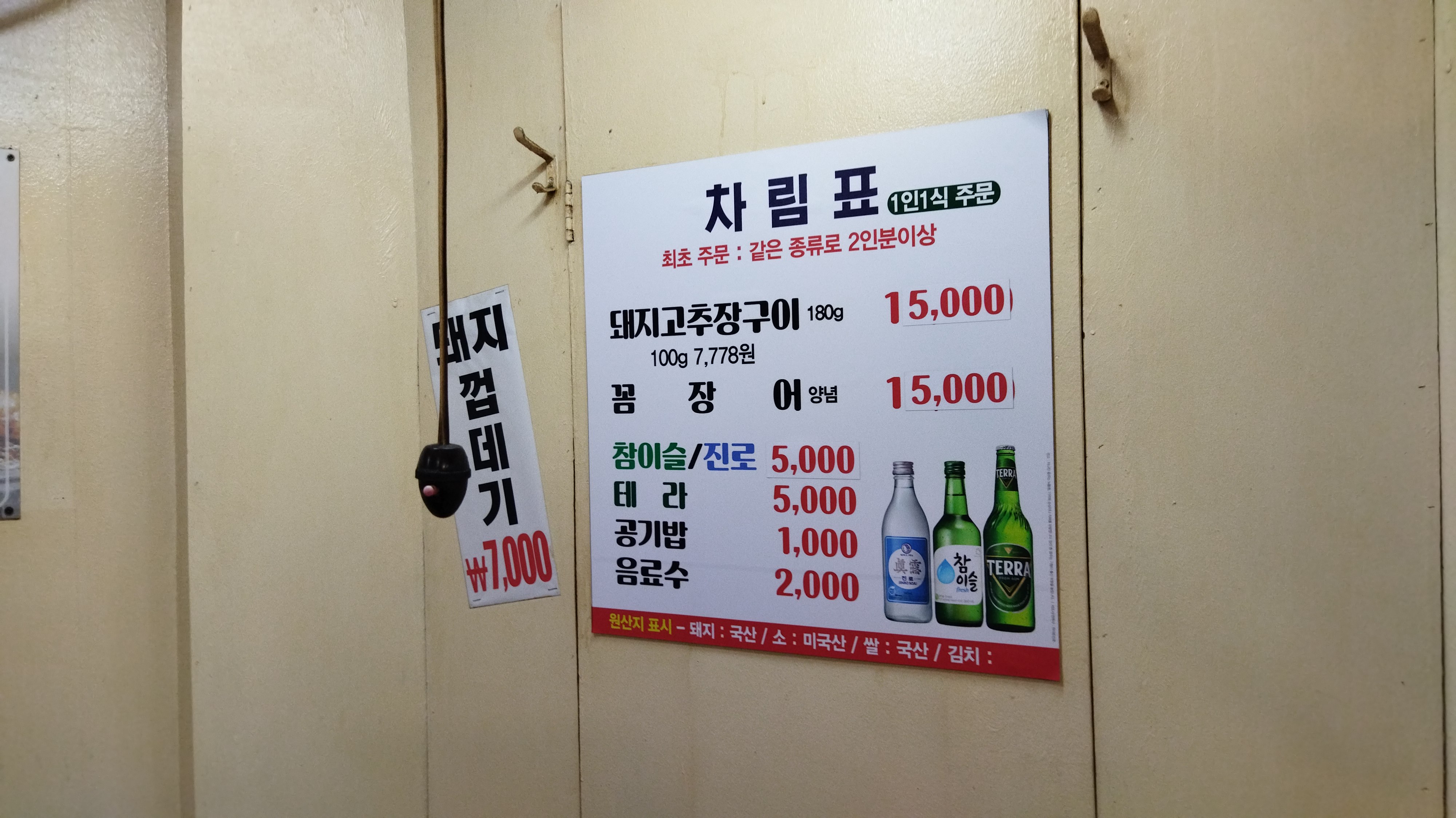 메뉴는 돼지고추장구이 15,000원, 꼼장어 15,000원 딱 2가지. 단 같은 종류로 2인분 이상 주문해야 다음 주문이 가능.
