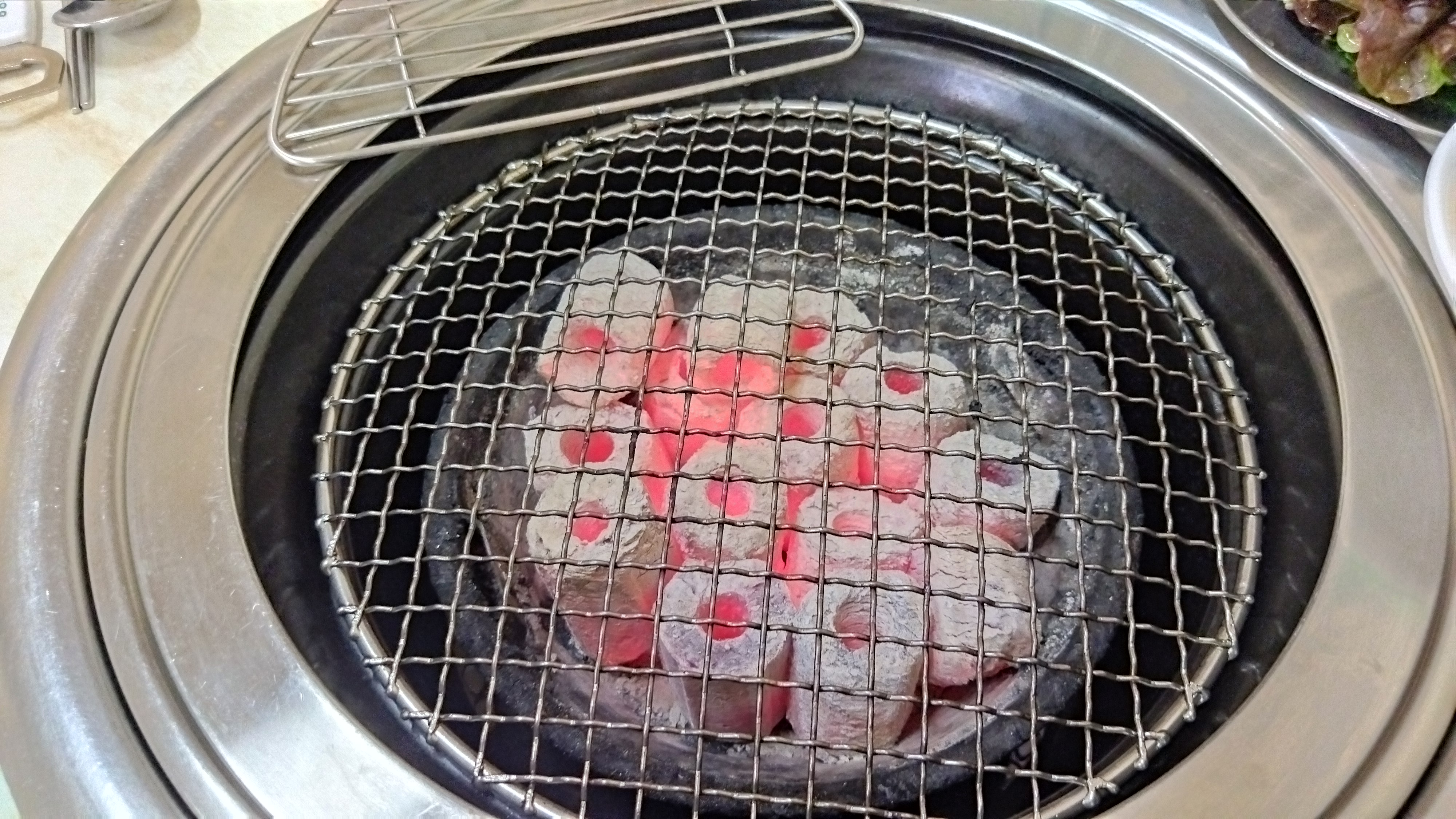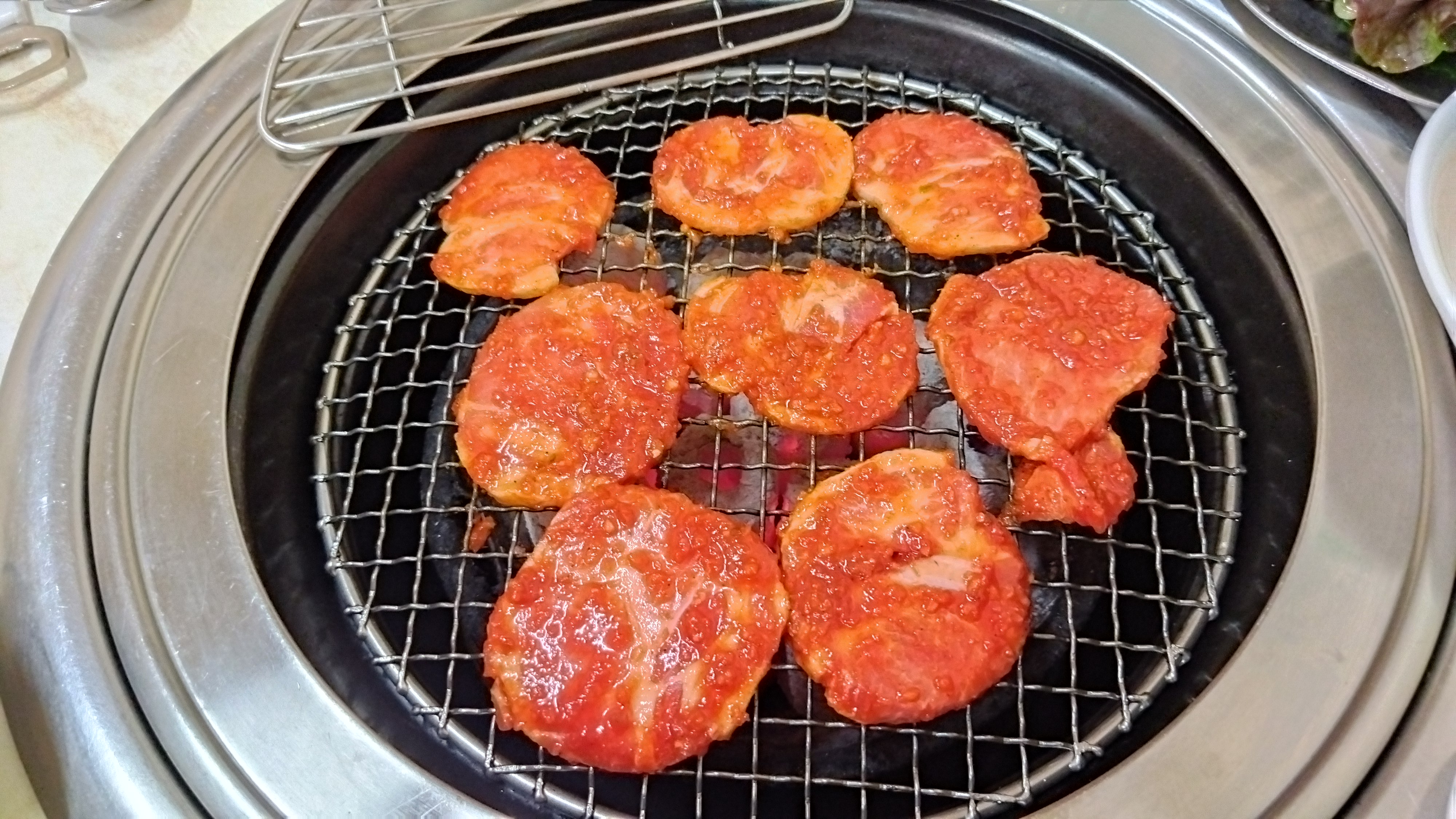 화력이 좋은 숯불 위에 동그랑땡 모양의 돼지양념구이를 굽는다.