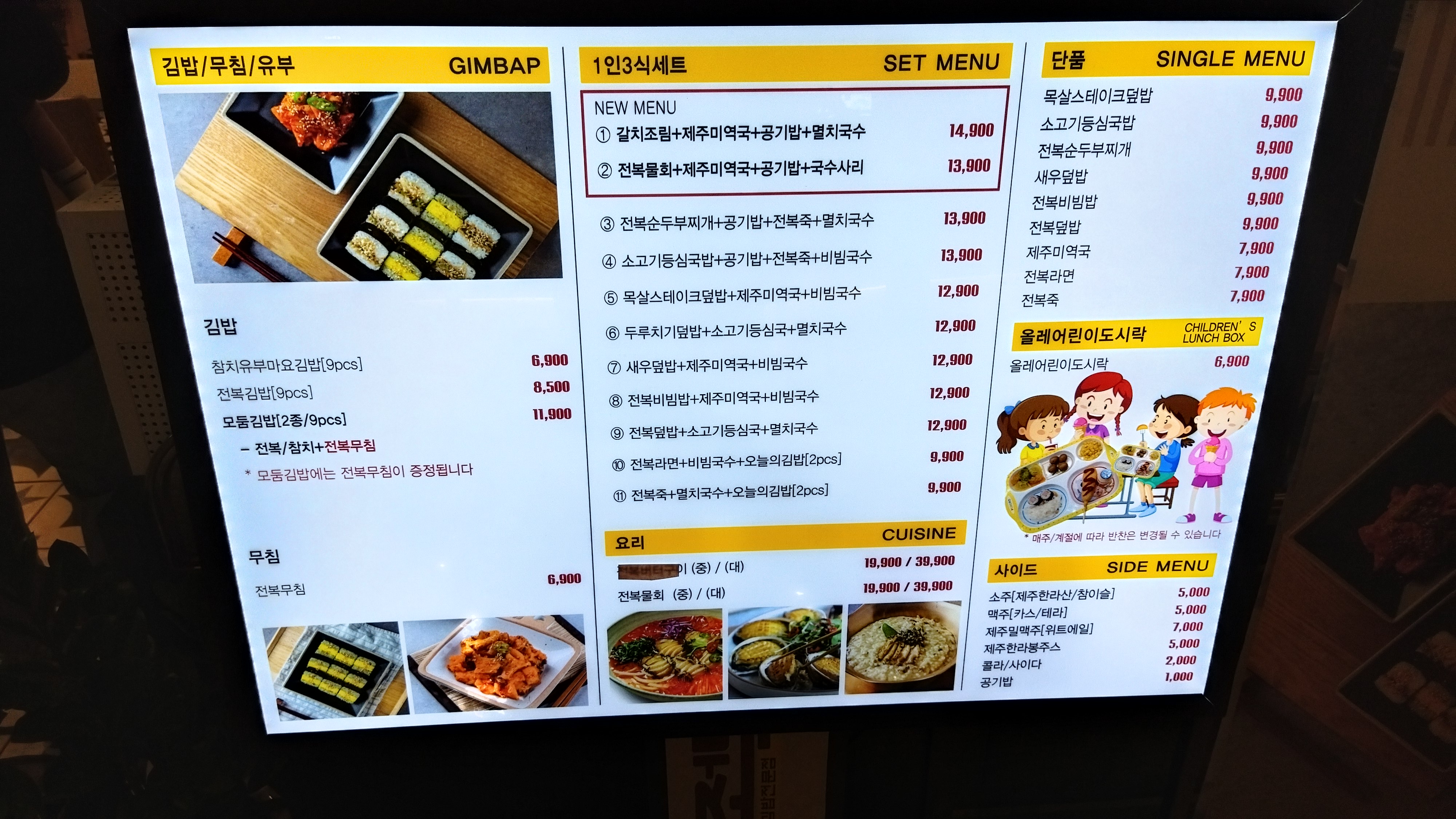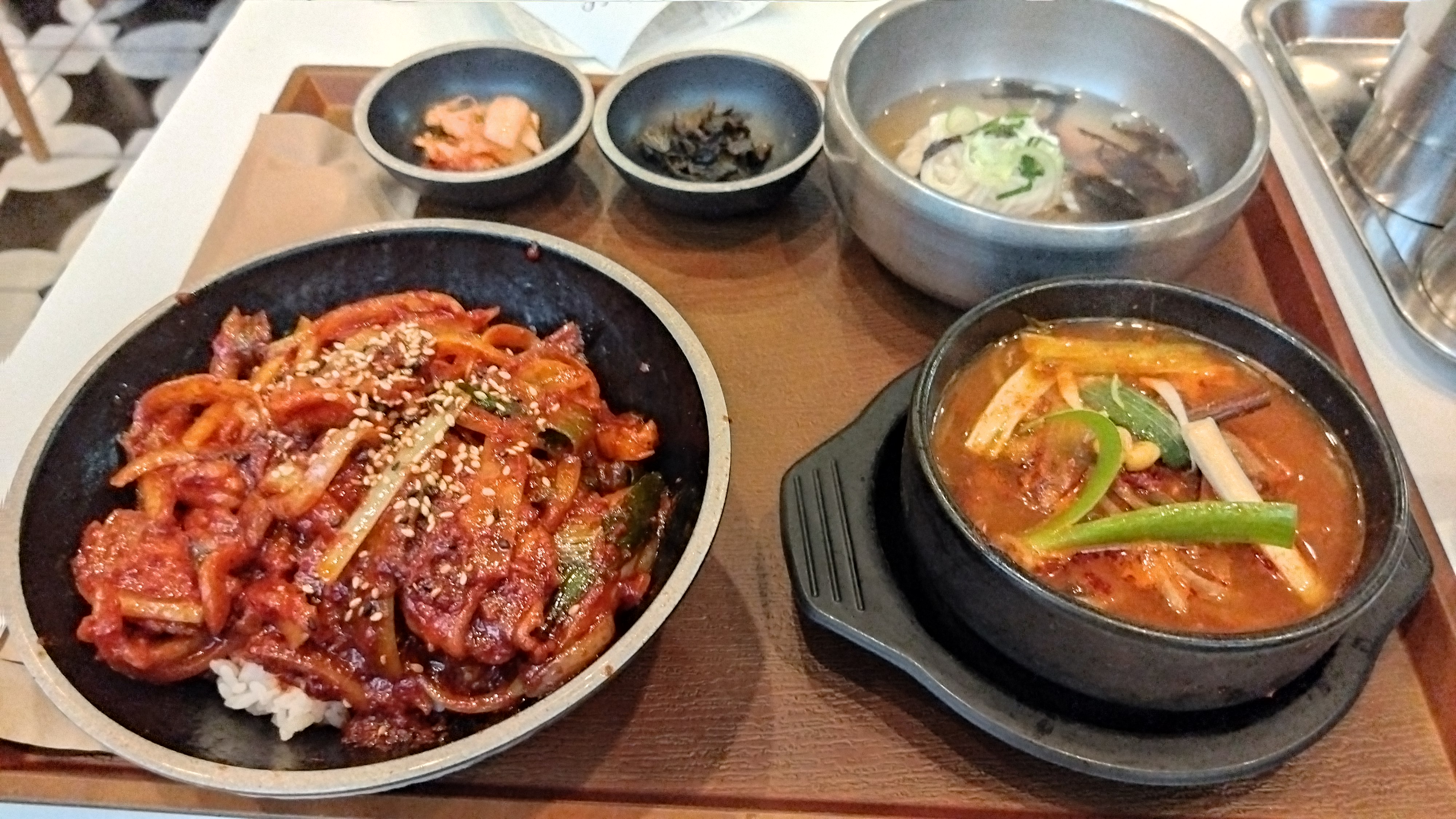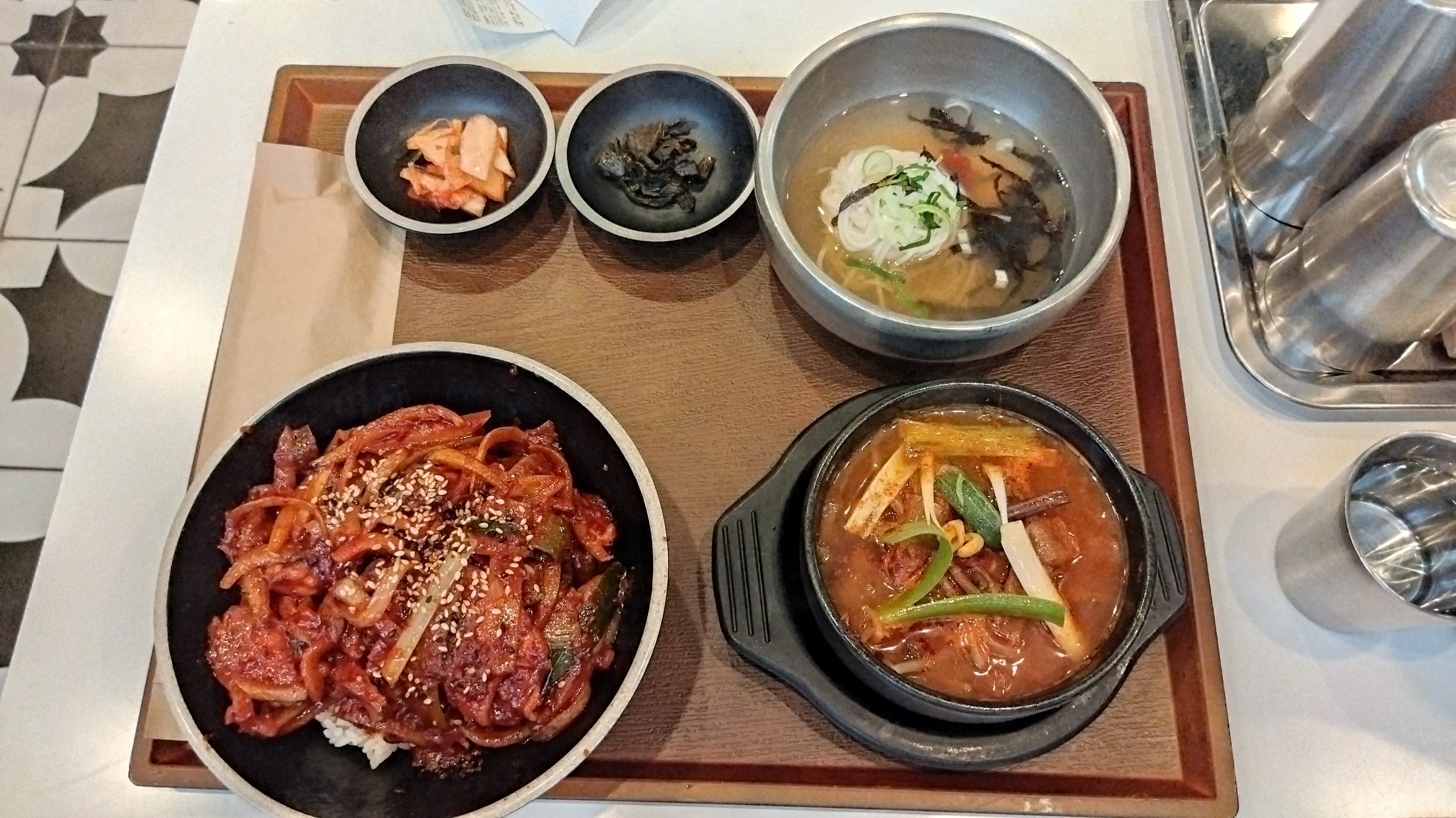 1~3번이 시그니쳐인듯 한데 전복물회가 맵다고 하여 무난해 보이는 두루치기덮밥+소고기등심국+멸치국수를 주문했다. 12,900원.