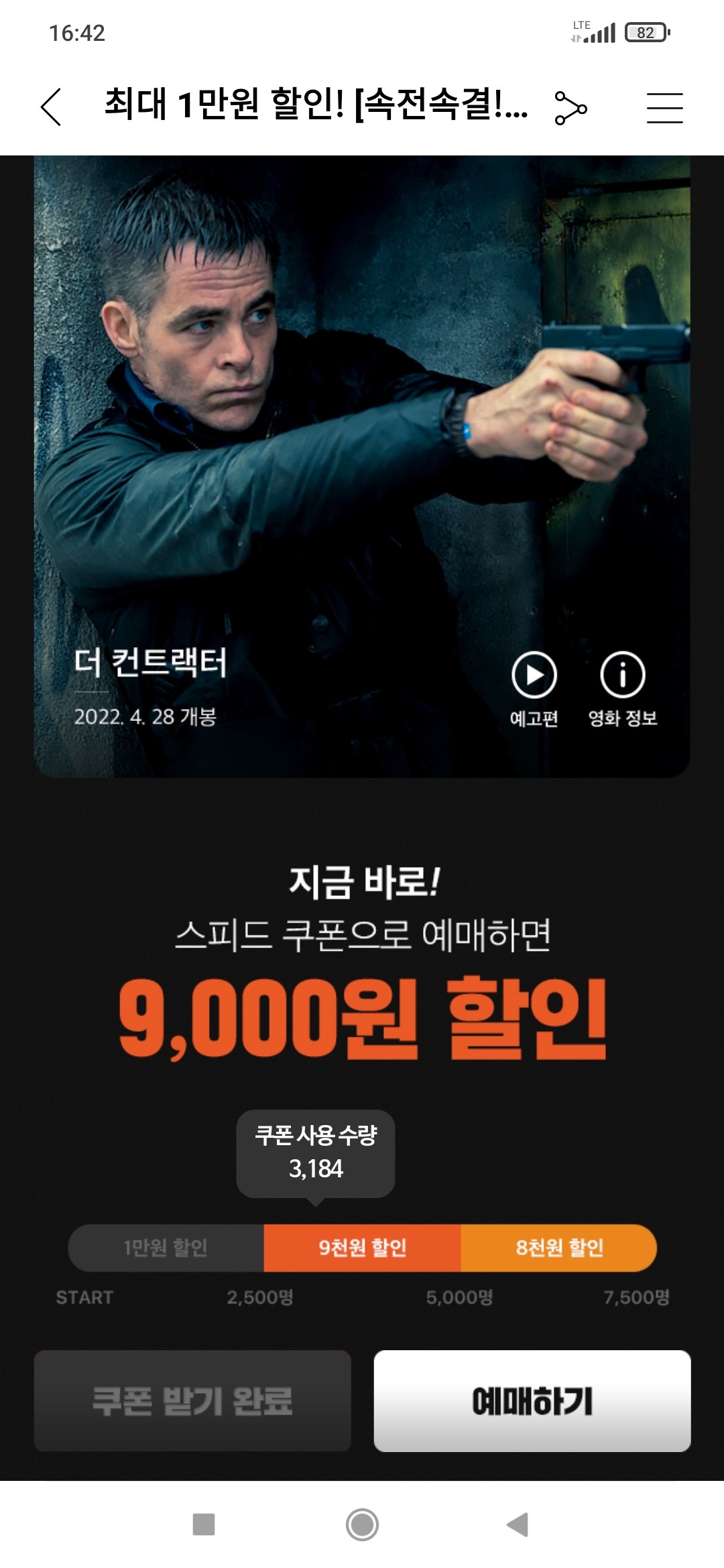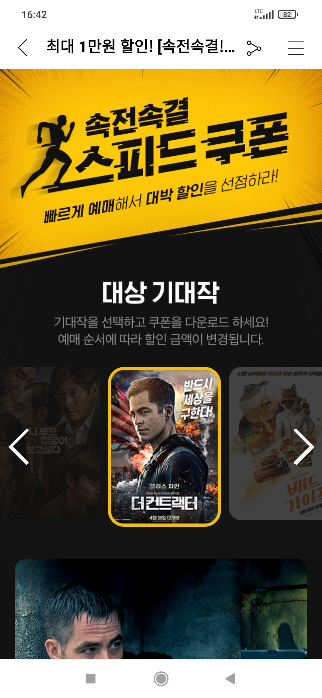 나는 쿠폰 도착과 동시에 결제해 1만원 할인 혜택을 받아 5천원에 영화를 보았다. 더 컨트랙터는 그냥 그런 액션영화였다. 나쁘지는 않았다.