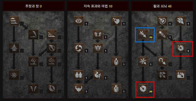 대충 이런 식이다. 냉기계열 최하단 빙결화살이 메인스킬, 얼음내성몹에게는 폭발화살이다. 파란색으로 표시한 냉기화살은 빙결화살 데미지를 올려주므로 마스터하지만 실제 사용하지는 않는다.