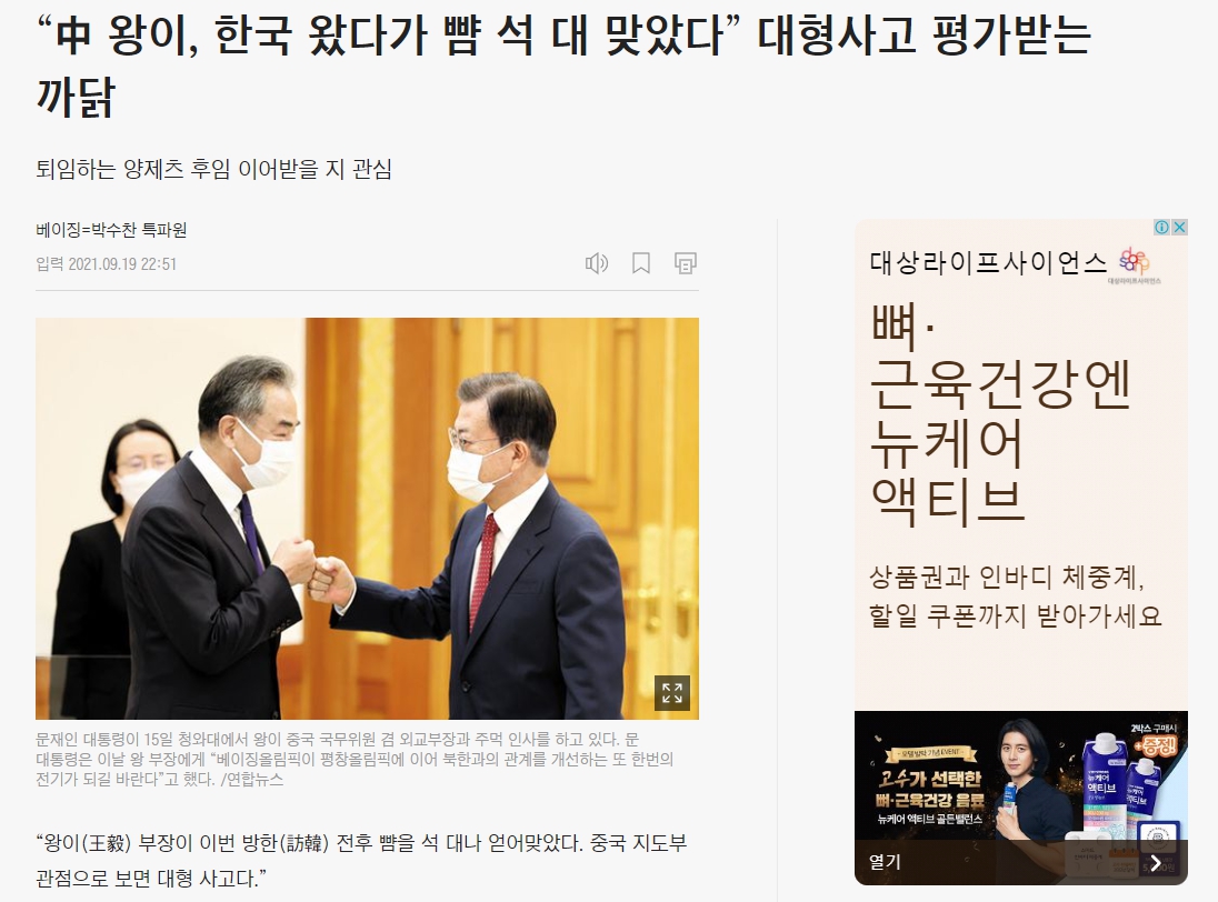 2021년 9월 중국 왕이 외교부장 방한일에 맞춰 한국은 SLBM 시험발사에 성공한다. 베이징 올림픽 등 협력할 것은 협력하면서 중국에 무력시위도 같이 한 것이다. 대한민국 역사에 없었던 순간이었다. 이를 두고 중국 언론 뿐만 아니라 조선일보조차도 중국이 한국에게 뺨을 맞았다고 평가했다.