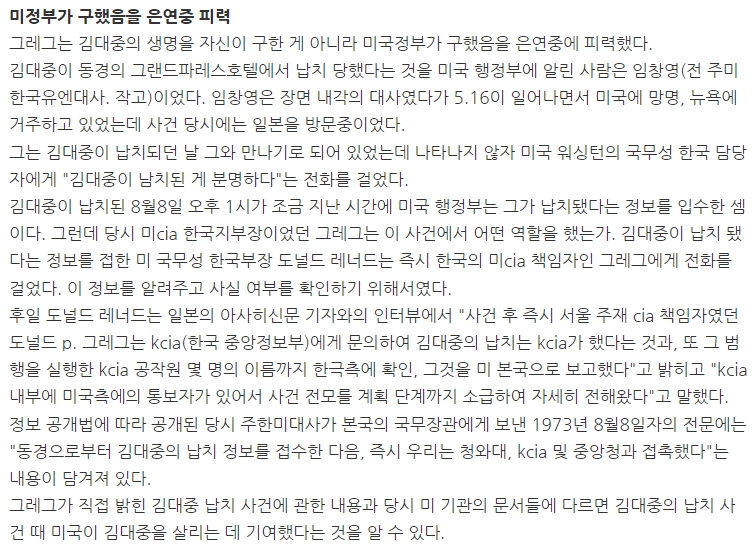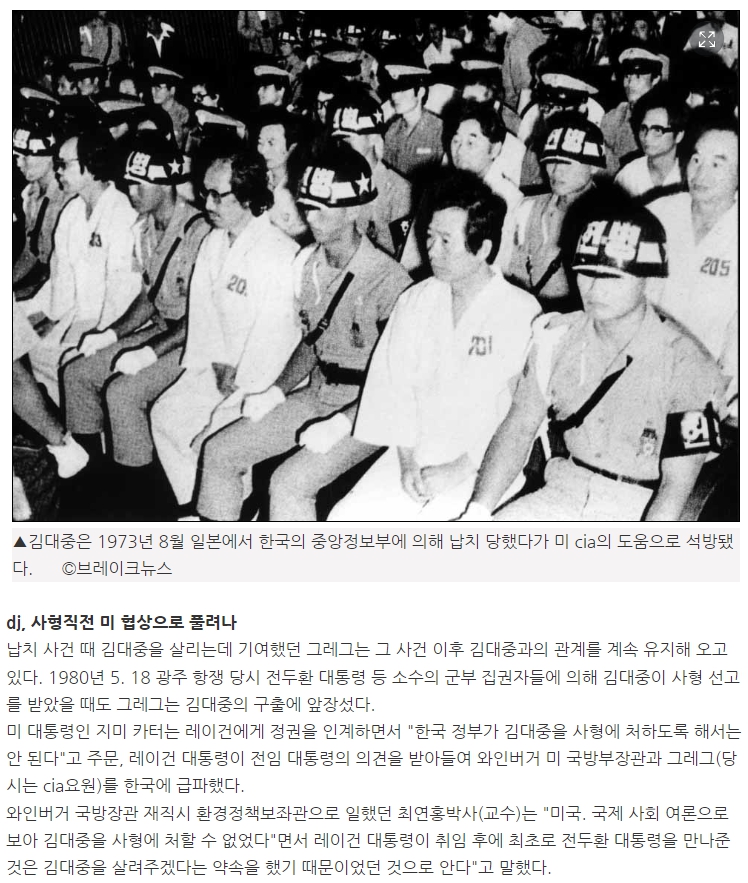 CIA가 일본과 한국에서 종횡무진하며 김대중을 살린 것은 이미 널리 알려진 사실이다. 심지어 전두환 시절에는 김대중이 미국으로 망명했을때 당시 미국 하원의원이었던 에드워드 페이언이 직접 김대중 귀국길에 동행하기도 했다. 미국 국회의원이 직접 김대중과 만나고 동행하는 장면을 연출함으로써 당시 전두환 정권은 김대중을 더이상 손대지 못하게 된다.