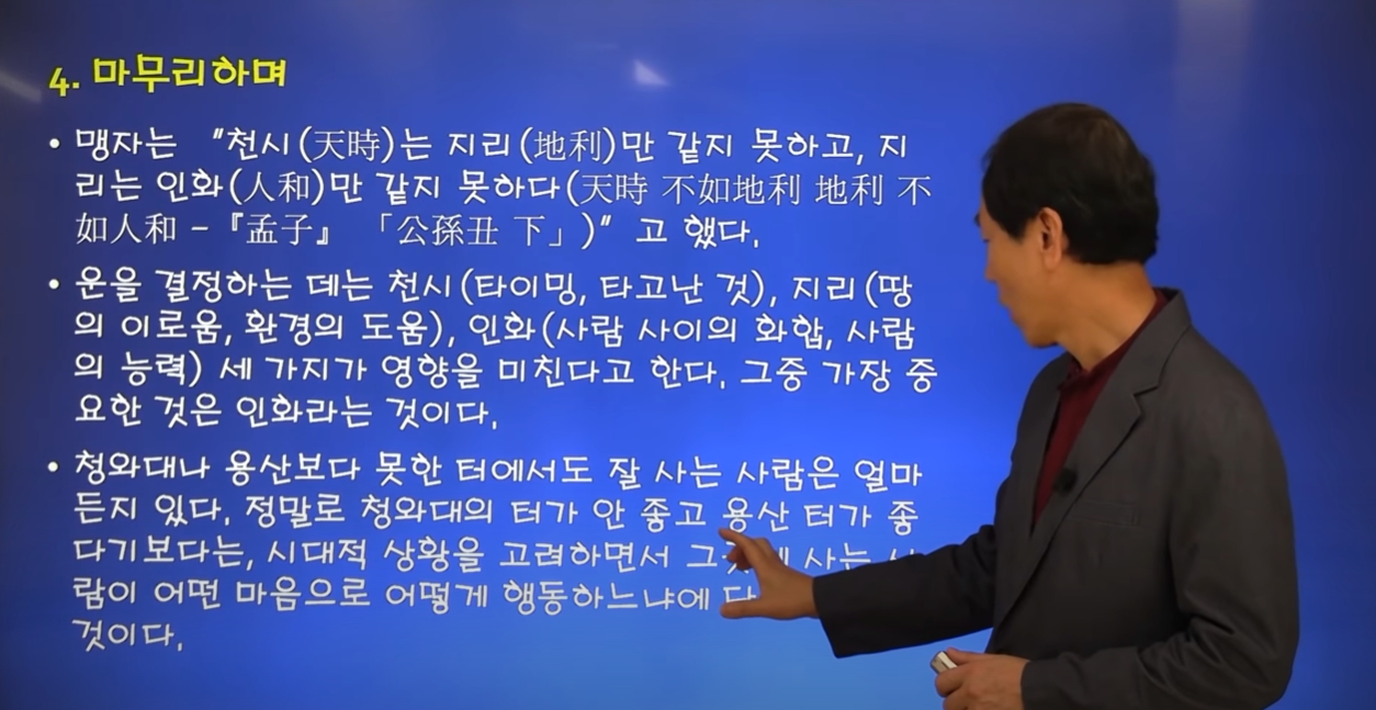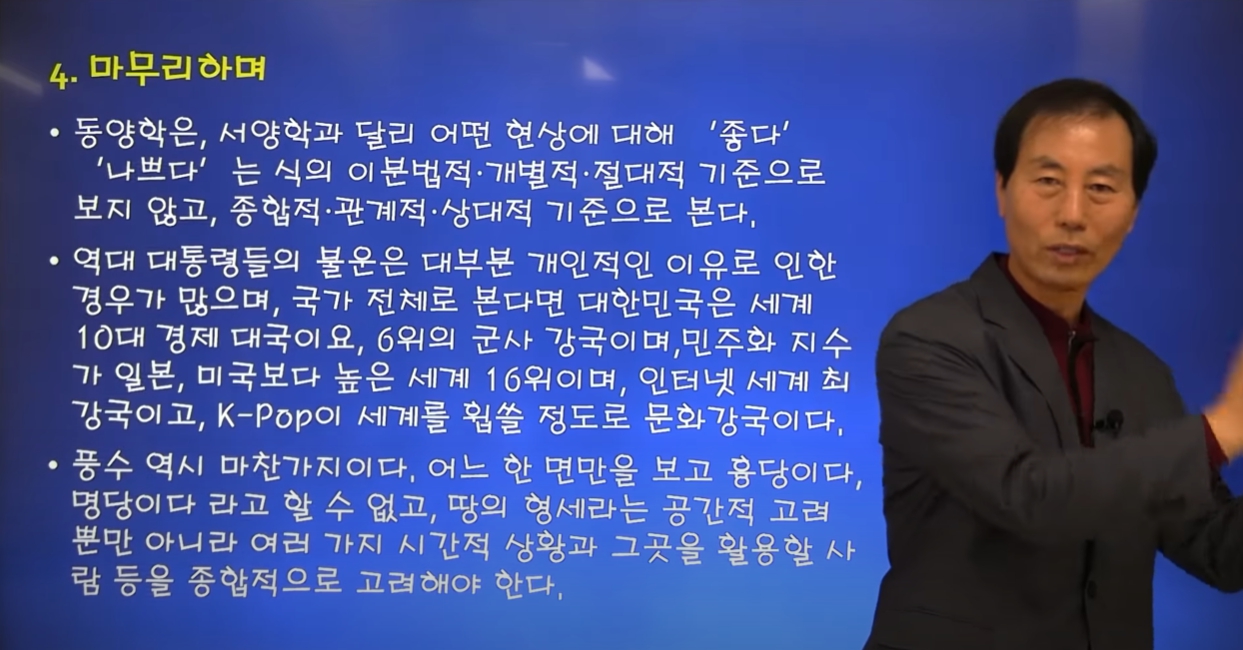이 교수는 청와대터가 나빴다면 대한민국이 10대 경제대국, 군사력 6위, 민주화지수가 미국보다도 높은 16위, 전자정부 2위, 인터넷 인프라 2위의 강대국이 될 수 있었겠느냐고 반문한다. 타당한 질문이다. 동양학은 이분법이 아니라 종합적, 상대적 기준으로 판단하며, 풍수 역시 공간, 시간, 사람 등을 종합적으로 고려해야 한다는 것이다.