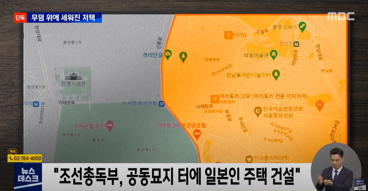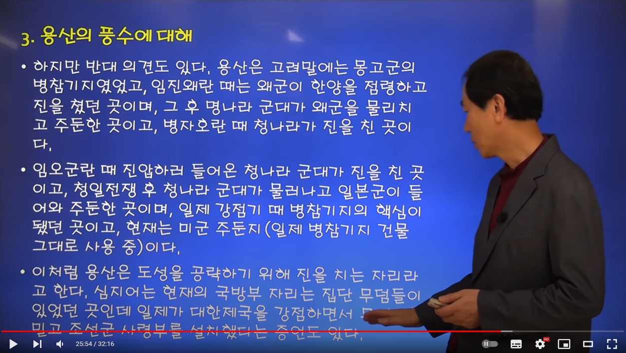 용산은 위 MBC의 보도처럼 100만구의 시신이 묻혀 있던 공동묘지이기도 했지만, 역사적으로 사건사고가 많았고 특히 민비에 의해 청나라 군대가 주둔했던 것을 시작으로 근대사 내내 외국 군대가 주둔했던 곳이다. 이 교수는 고려 말 몽고군의 병참기지, 임진왜란때 명나라 군대가 왜를 물리친 후 주둔했던 곳, 병자호란때 청이 진을 쳤던 곳이라는 점도 짚어 낸다.