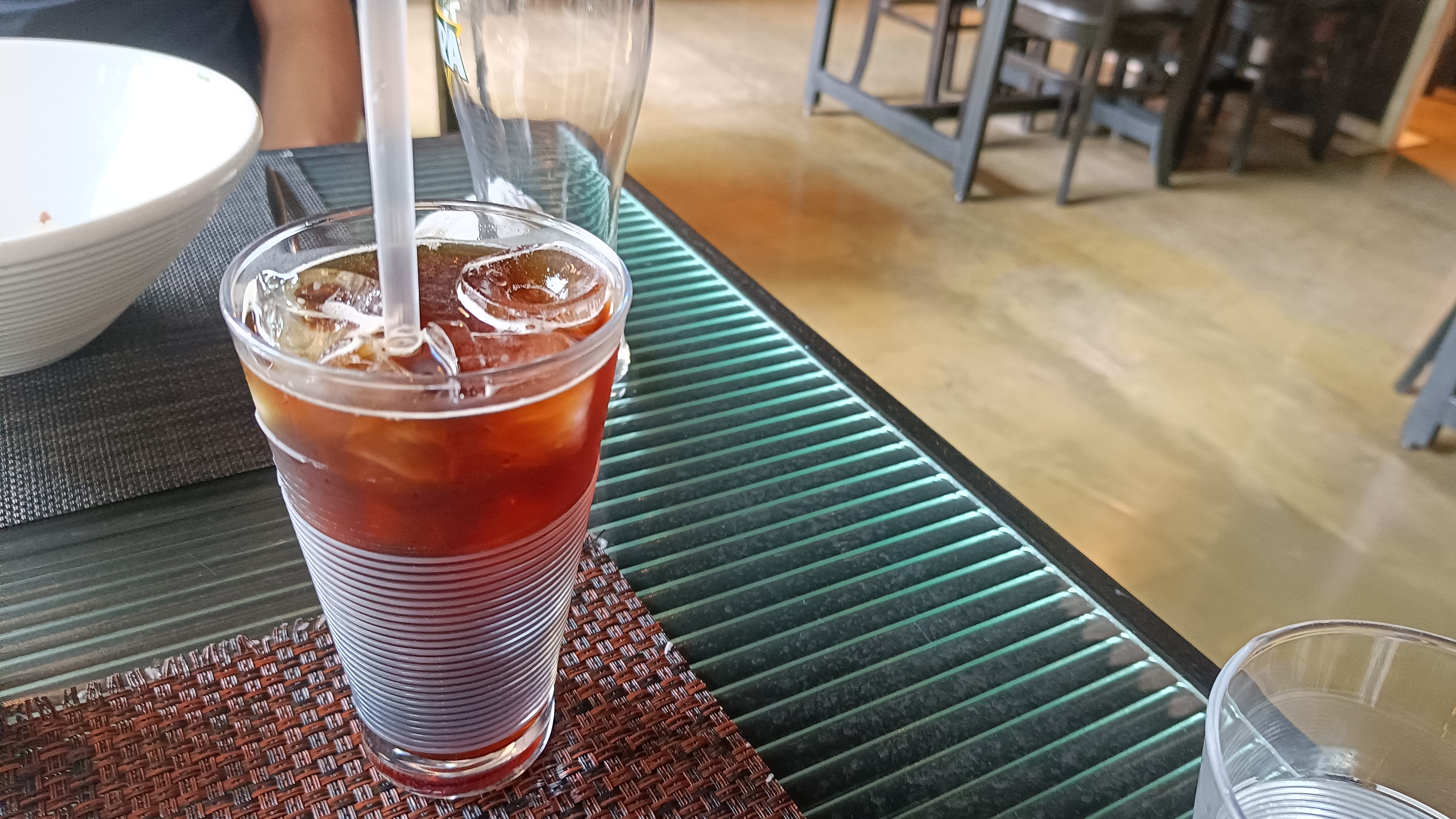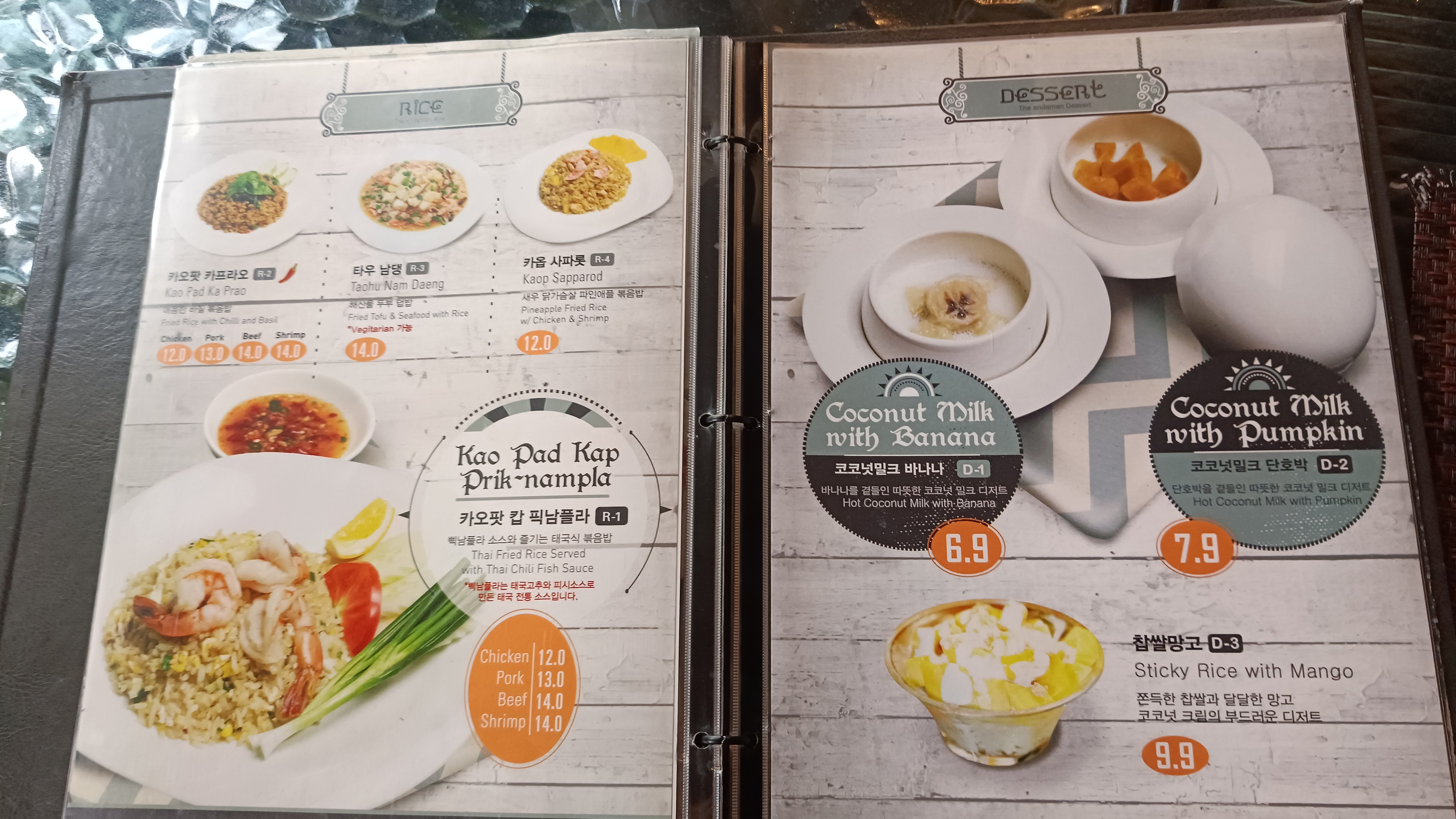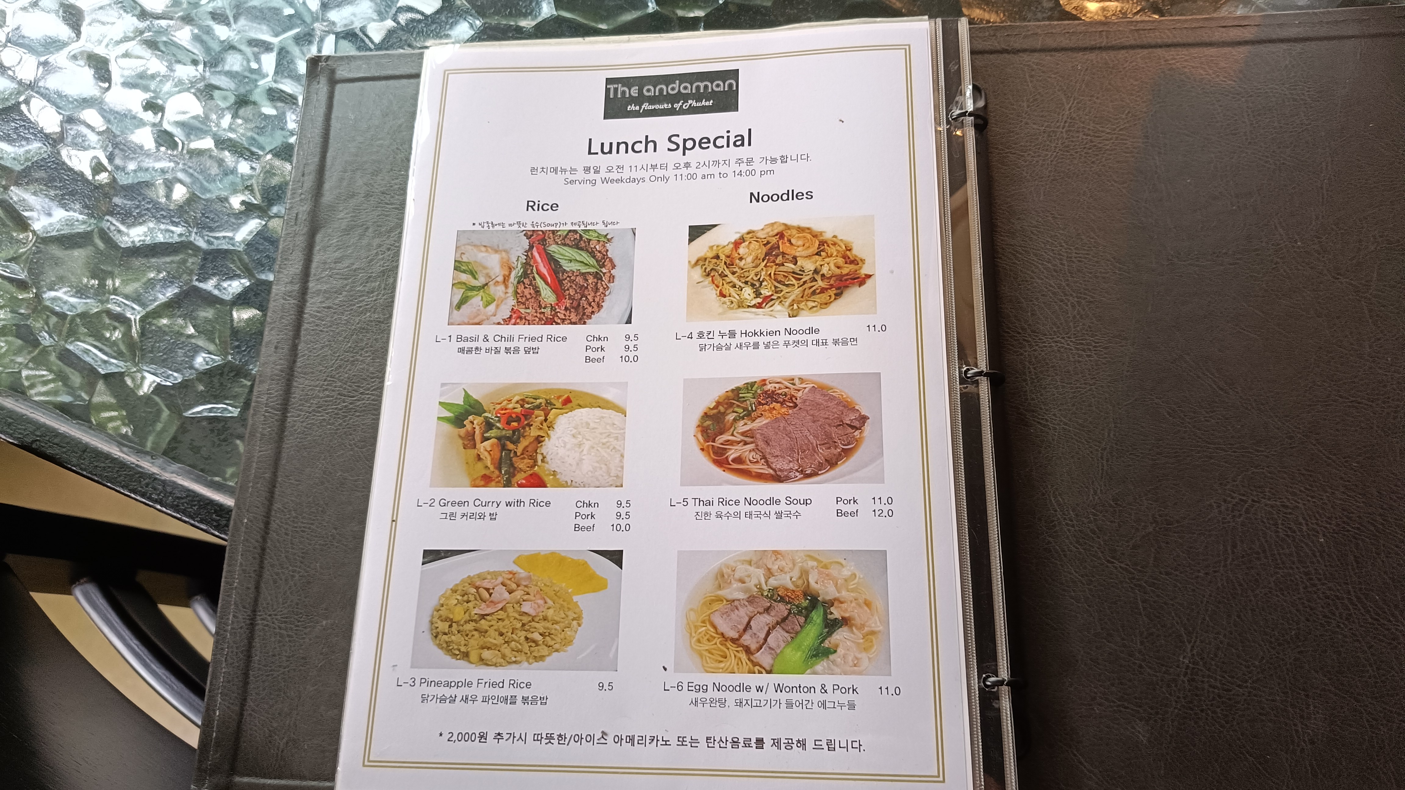 런치 스페셜 중 에그누들 11,000원, 치킨 그린커리 9,500원, 런치메뉴에 2천원 추가하면 나오는 아이스 아메리카노를 주문한다.