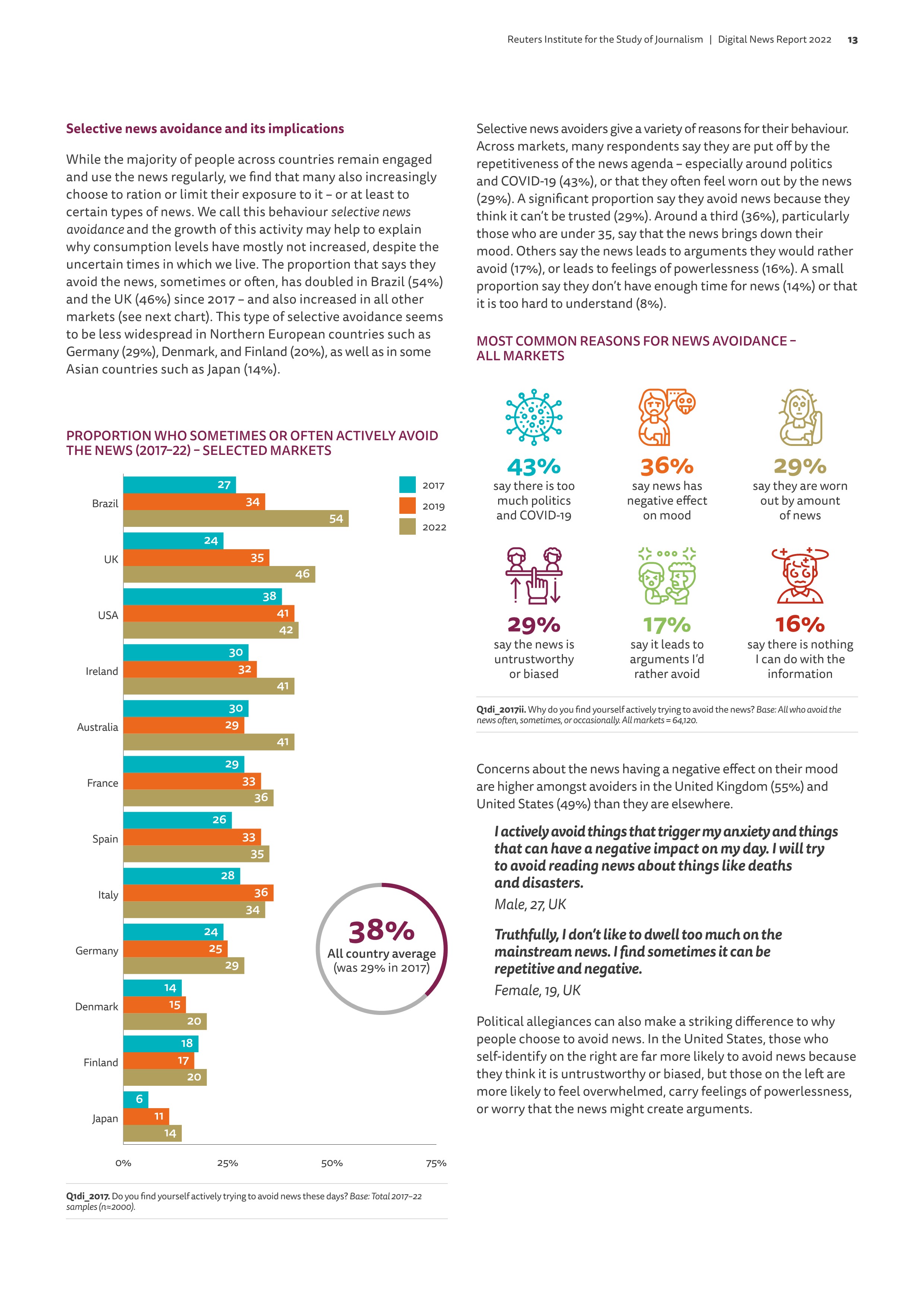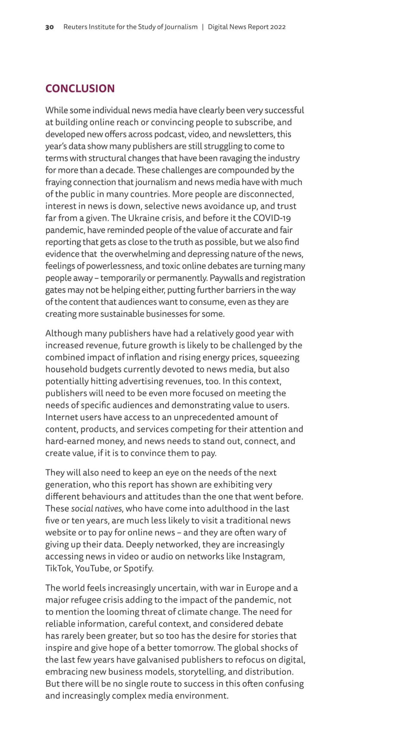 이번 보고서에서 로이터 재단은 언론 환경에 구조적인 변화가 일어나고 있음을 지적한다. 코로나와 우크라이나 전쟁같은 심각한 상황에서 보다 정확한 뉴스가 필요함에도 불구하고 오히려 무거운 뉴스는 기분을 가라앉히고 온라인에서 극단적인 논쟁이 심화되며 대중들의 뉴스에 대한 관심과 신뢰가 줄어들고 뉴스 기피 현상까지 일어나고 있다는 것이다. 2030 세대는 아예 뉴스를 직접 보려고 하지도 않으며 인스타, 틱톡, 유튜브에 훨씬 더 몰입하고 있다. 전통 매체의 광고수입이 극단적으로 낮아진 상황에서 언론사들은 구독경제 뿐만 아니라 매체 환경 변화, 대중들의 심리 변화에 맞는 사업모델 창출, 스토리 텔링과 전파 방식의 변화를 꾀해야 할 것이라고 이 보고서는 말하고 있다.