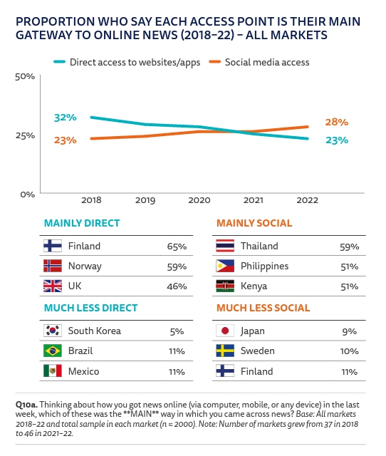 심지어 온라인에서조차도 뉴스를 직접 들어가서 보는 비중이 낮아지고 있고, 한국은 심각하게 낮다. 일본이 TV를 통해 뉴스를 접하는 비중이 45%인 것과 한국의 상황은 대조적이다. 한국은 SNS 뿐만 아니라 커뮤니티, 쉽게 풀어쓴 이메일 뉴스 등의 영향이 매우 크다고 볼 수 있다.