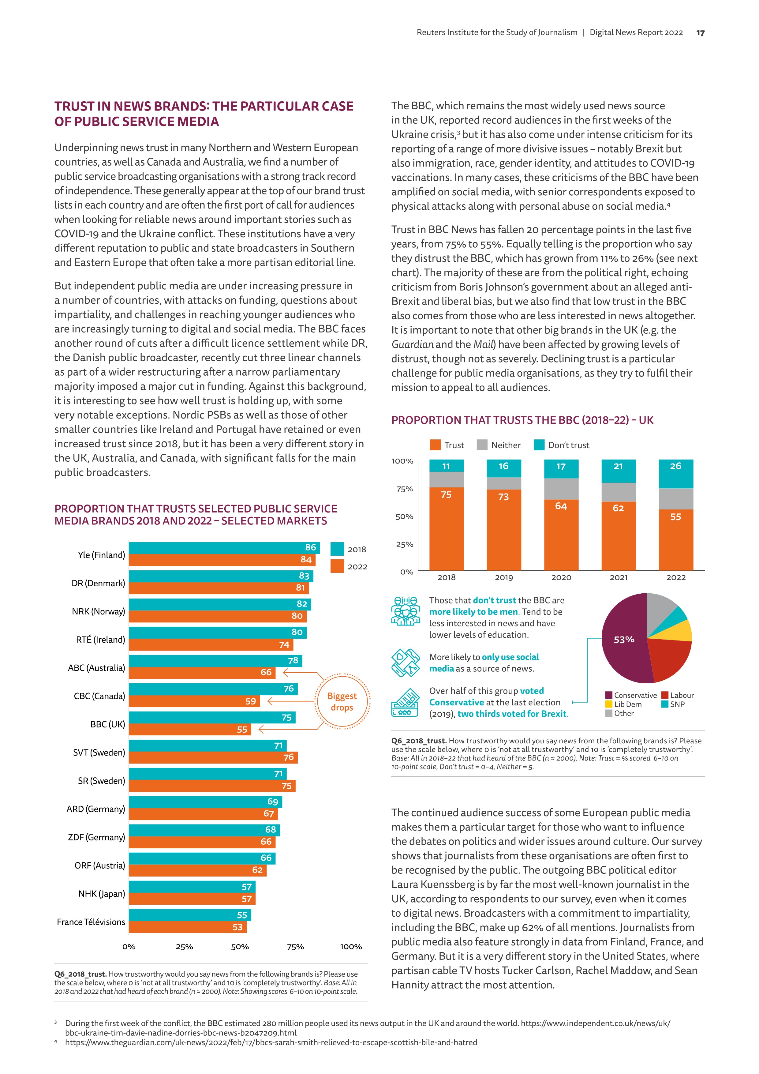 레거시 미디어의 영향력 또한 감소 추세다. 덴마크 공영방송의 경우 의회에서 예산이 대폭 삭감되며 유선방송 채널이 줄어든 이유도 있지만 이러한 예산 문제 뿐만 아니라 소셜 미디어의 영향력이 갈수록 커지고 있기 때문이다. 영국의 경우 2018년에 비해 BBC의 신뢰도가 무려 20%나 줄어들었는데, BBC를 신뢰하지 않는 사람들은 대부분 학력이 낮고 뉴스에 관심이 없는 남성들이었다. 이들은 뉴스를 '오직' SNS를 통해서만 접하며 이들 중 절반이 지난 선거에서 보수정당에 투표했고 무려 3분의 2가 브렉시트에 찬성했다. 이런 현상은 영국 뿐 아니라 세계적인 추세일 것이다. 조선 또한 예외가 아니다.