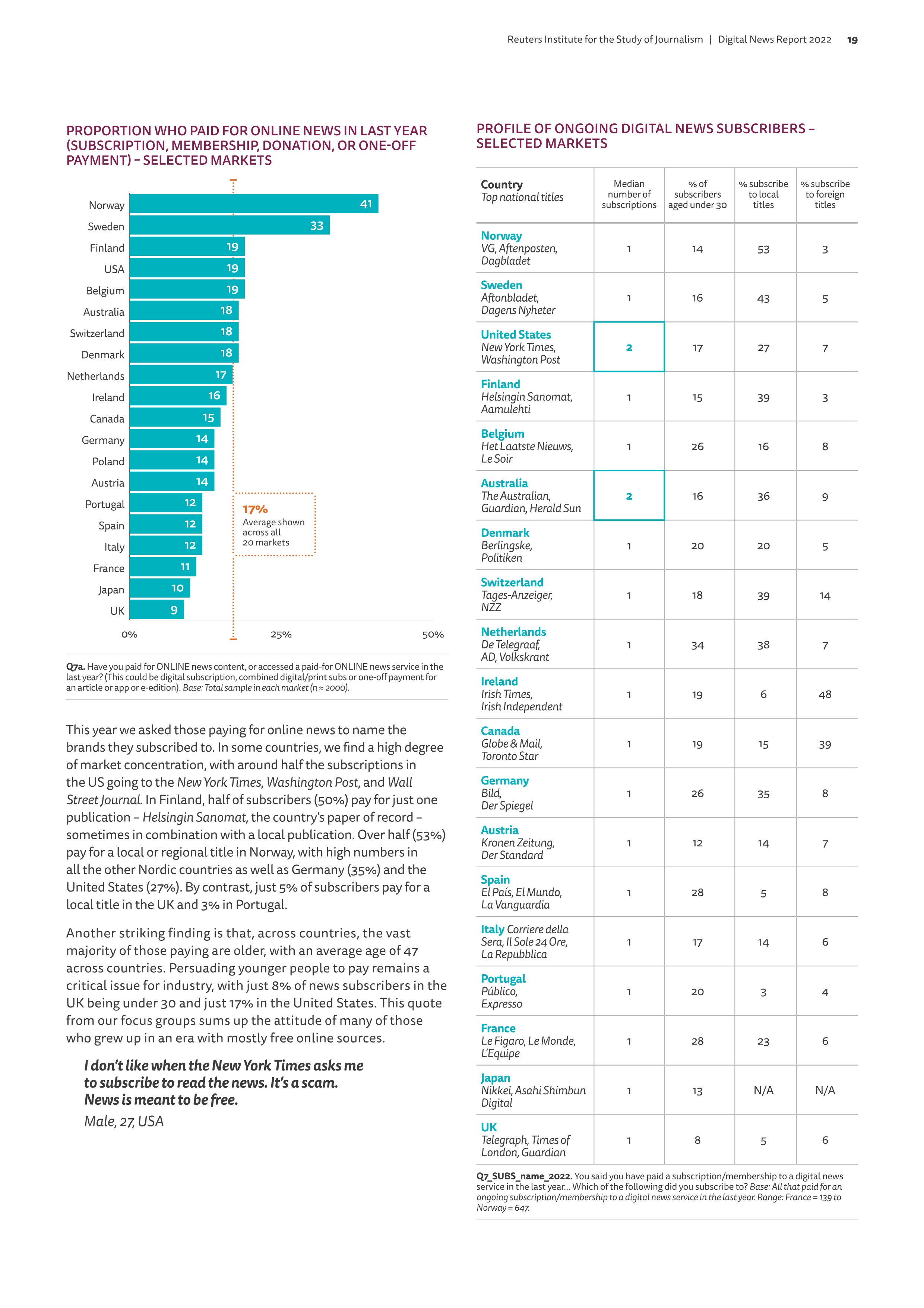 뉴스의 유료 구독자들 역시 갈수록 줄어들고 있으며, 특히 젊은층은 뉴스에 돈을 내는 것에 저항감을 느끼고 있다. 노르웨이, 스웨덴을 제외하면 미국이 19%, 영국이 9%로 평균 17%을 나타내고 있는데, 이 평균치는 20개국 기준이므로 한국 등이 포함되면 한자리로 떨어질 것이다. 반면 영국의 경우 넷플릭스, 디즈니 플러스 등 TV 매체에는 65%가 돈을 내고 있었고, 음악 스트리밍에는 37%, 심지어 유료 스포츠 채널에 22%가 돈을 내고 있는 것으로 나타났다.