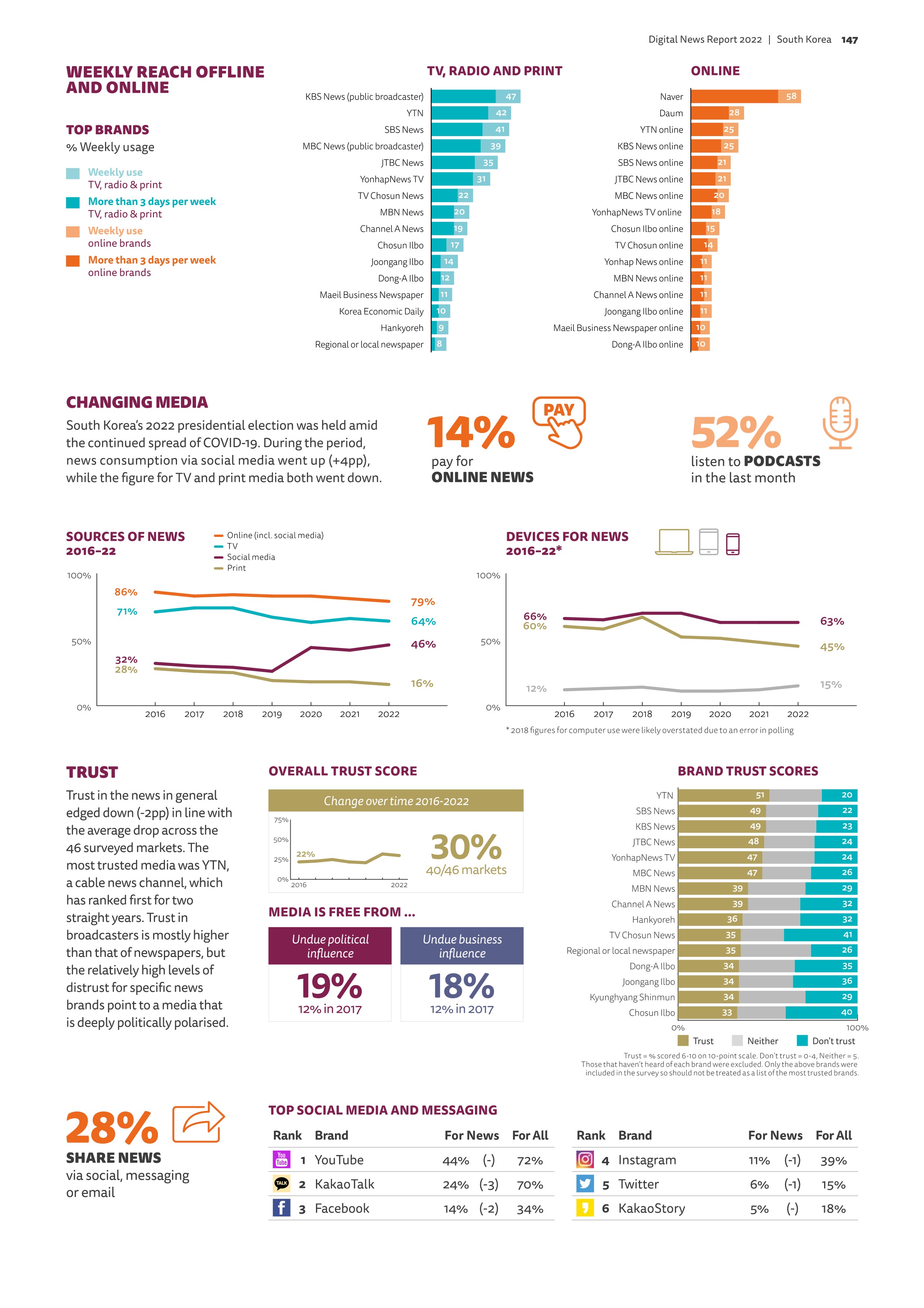 온라인에서 네이버가 여전히 58%를 장악하고 있지만 예전만은 못하다. 소셜미디어를 포함한 온라인의 영향력이 80% 아래로 떨어졌음에도 소셜미디어가 46%로 치고 올라온 점이 이를 설명해 준다. 가장 신뢰 받는 언론사는 YTN이었고, 최하위는 조선일보였다.