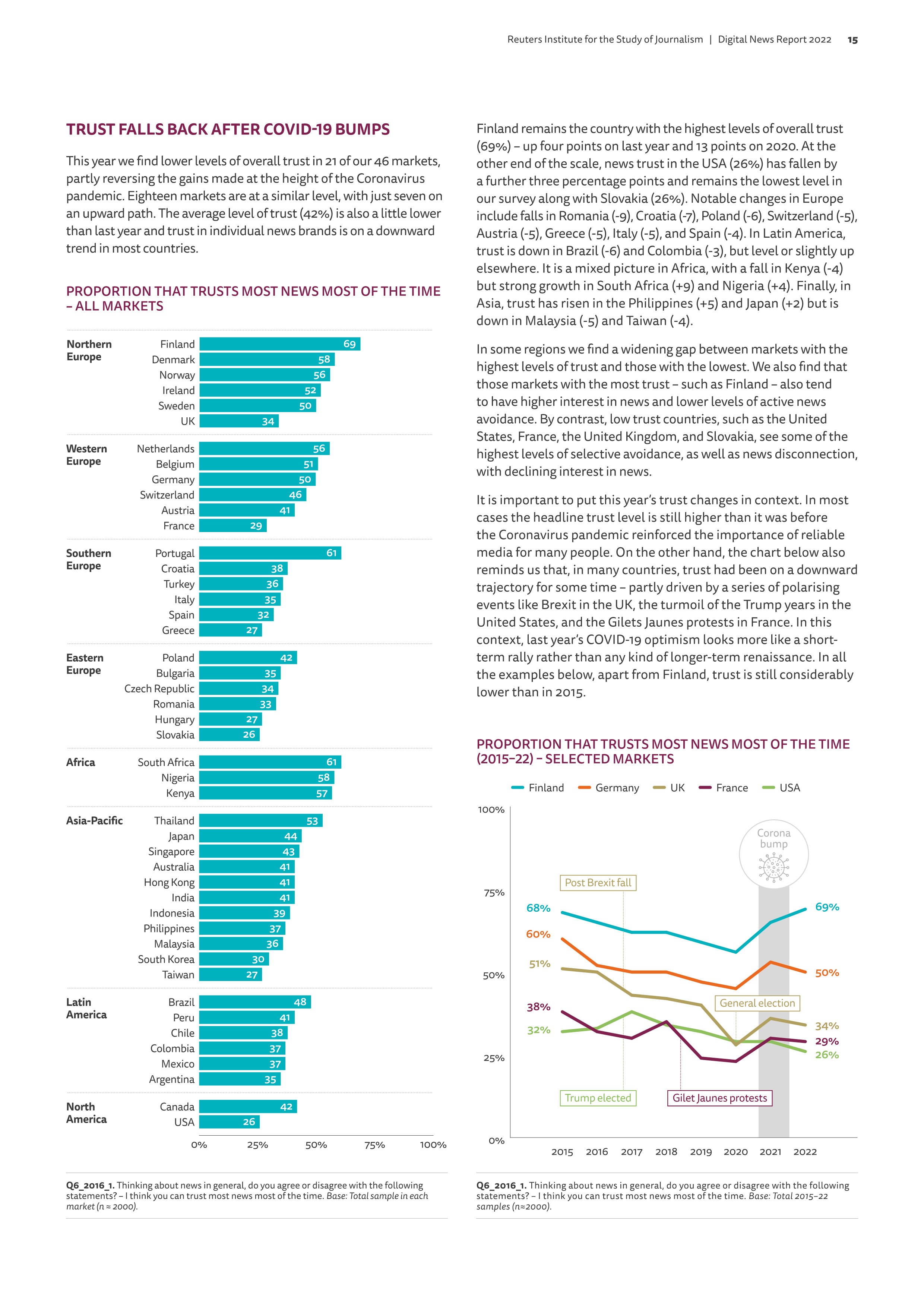 언론에 대한 신뢰도도 전반적으로 하락 추세다. 핀란드 등 일부 북유럽 국가를 제외하고는 코로나 사태 전후 잠깐 반등했다 다시 하락세로 돌아서는 모습이다.