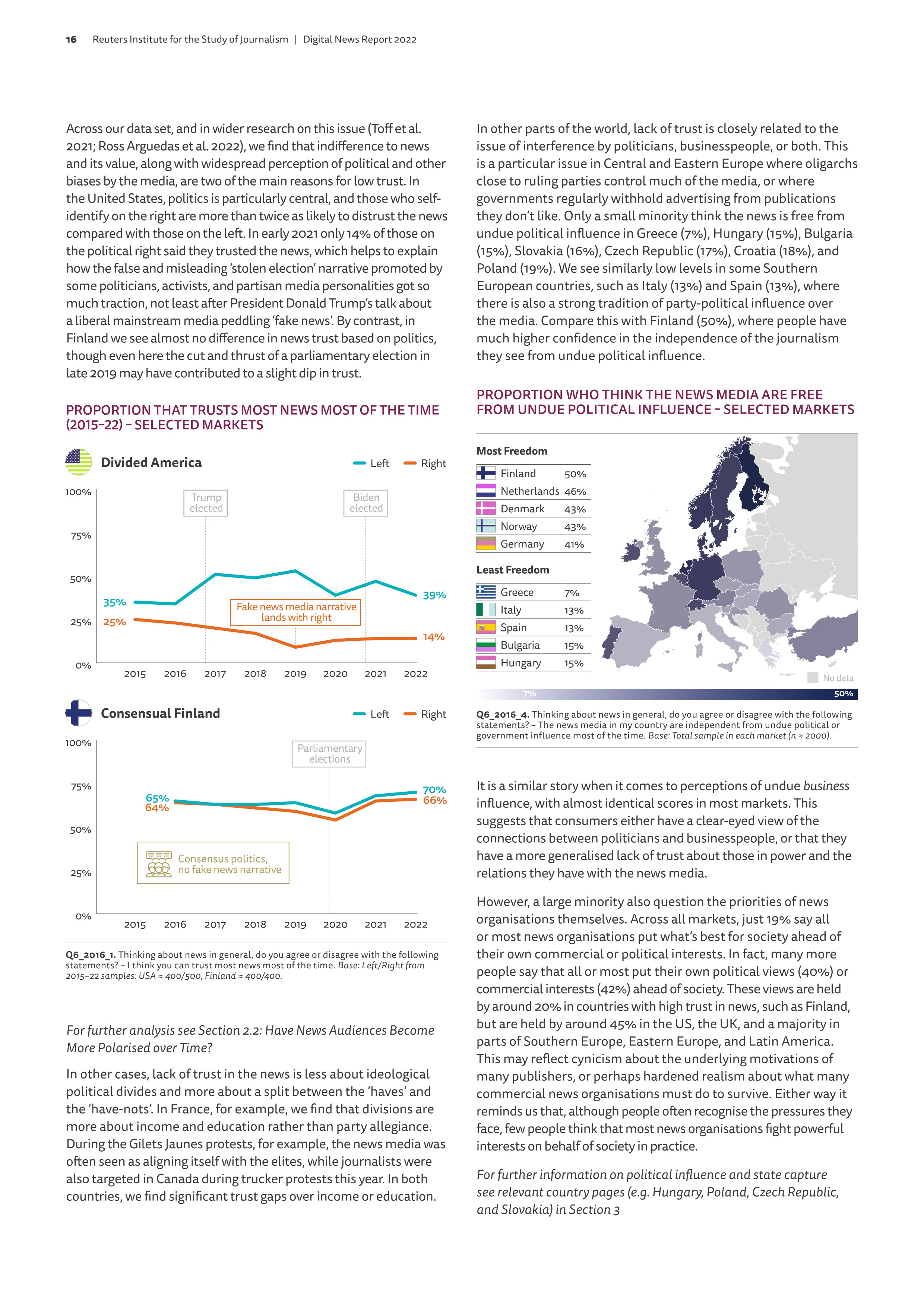 정치가 매체와 뉴스를 지배하는 현상도 두드러진다. 특히 미국의 경우 보수 유권자의 14%만이 뉴스를 신뢰한다고 말했다. 트럼프를 비롯한 보수 정치인들이 자신들에게 불리한 뉴스를 모두 가짜 뉴스라 몰아붙이고 도둑맞은 선거 네러티브를 대대적으로 선전한 영향이다. 이 말을 믿고 실제로 총을 들고 국회에 난입하는 사태까지 벌어진게 미국이다. 유럽도 언론이 정치로부터 자유롭다고 생각하는 비율은 갈수록 낮아져 북유럽 복지국가들을 제외하면 이탈리아, 스페인, 불가리아 등은 10%대를 기록했다. 언론이 정치의 도구로 전락했다는 반증이다.