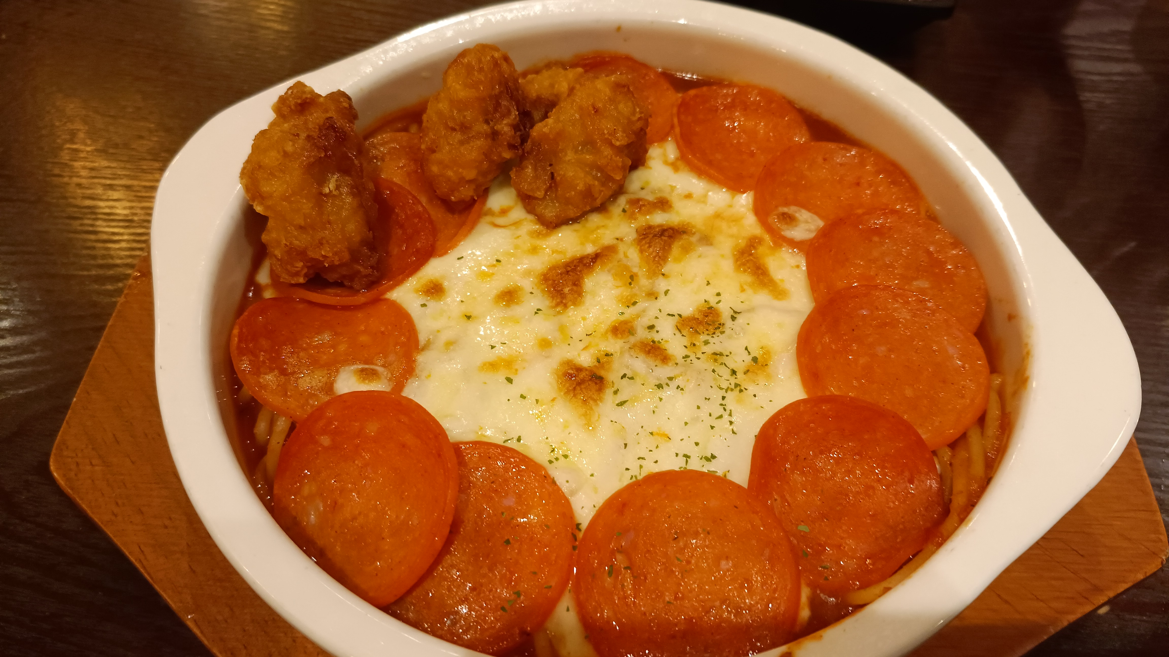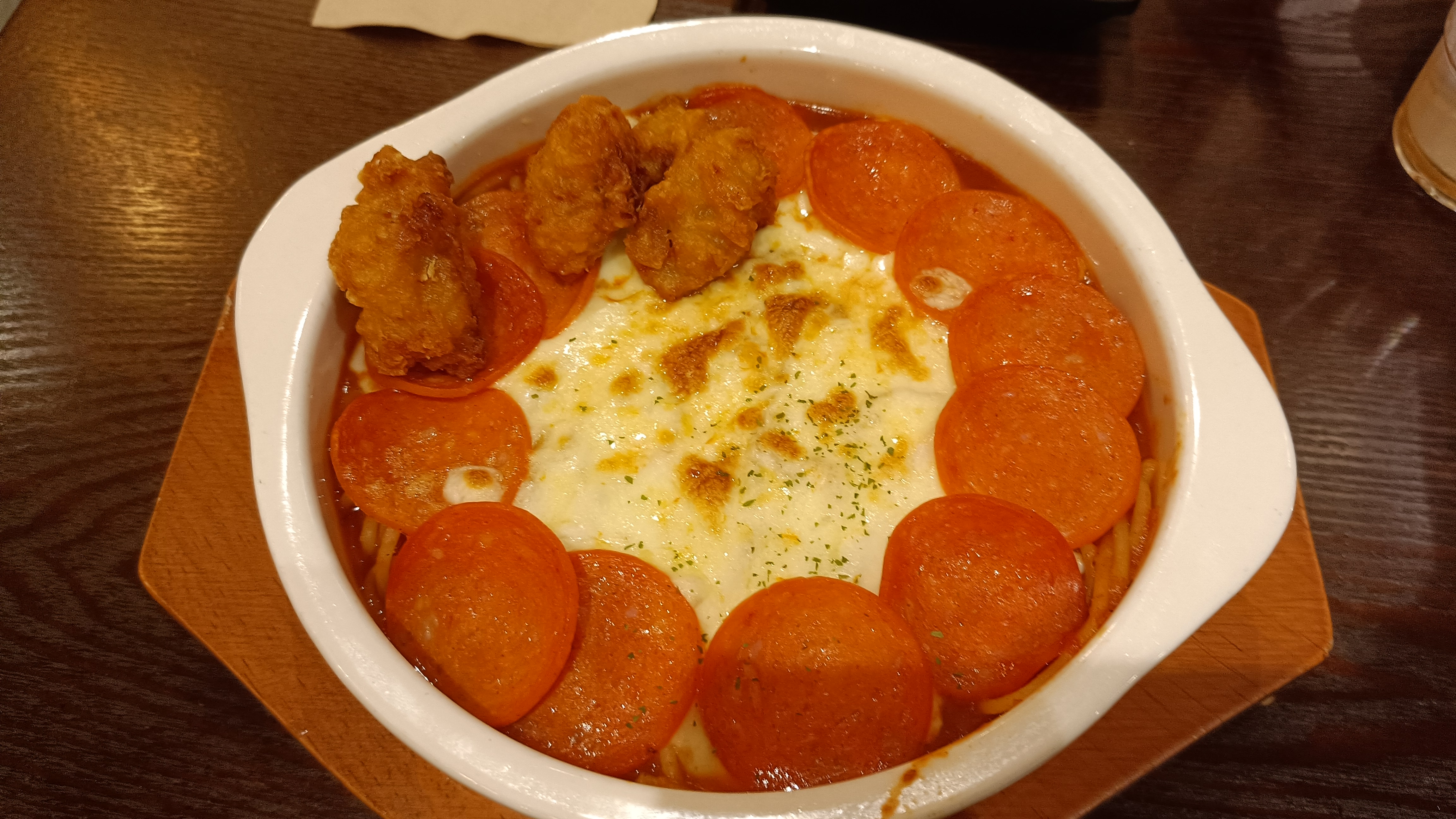 페퍼로니와 치즈로 토마토 스파게티를 덮은 형태. 카라아게는 매우 작다. 맛은 평점이 알려준대로 완전 보통맛. 페퍼로니로 시키길 잘 했다는 생각이 든다.